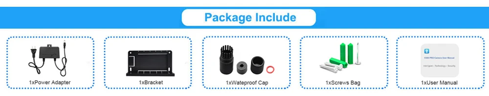 1x Power Adapter(EU/US/UK/AU For Options), 1x Bracket, 1x Waterpfoof Cap, 1x Screws Bag, 1x User Manual,