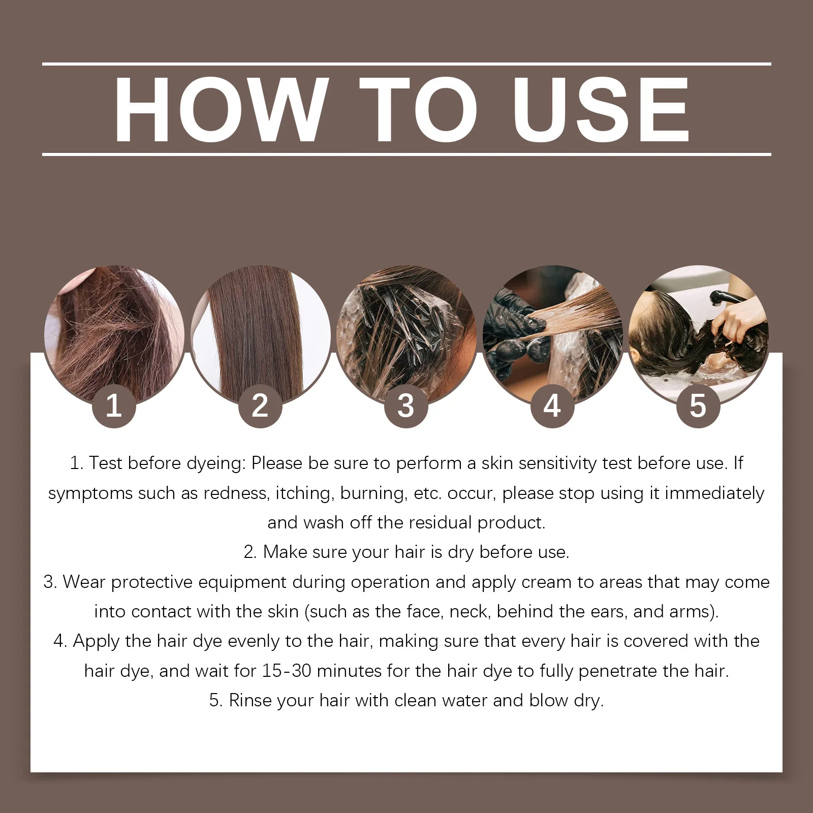1. Test before dyeing: Please be sure to perform a skin sensitivity test before use. If symptoms such as redness, itching, burning, etc. occur, please stop using it immediately and wash off the residual product.