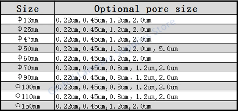 Tips: The optional pore size is showed in following sheet, pls leave message to us if you need any pore size, otherwize we will ship 0.22um pore size by default.