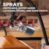 This versatile sprayer has the power to spray many materials such as urethanes, varnishes, oils, stains, sealers, enamels, glazes, water-based lacquer, thinned latex and more.