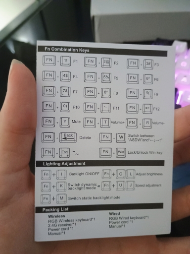 Everything came right, arrived on time, the LEDs work perfect, has the manual of commands for any doubt and the weight of him and the Keys is also very light in the way I imagined, only thing is that the key F5 gets a little turned on when u reduces the intensity to the maximum, But nothing that gets in the way because if you don't want the LEDs on just hang up, I love it!