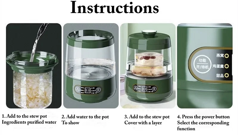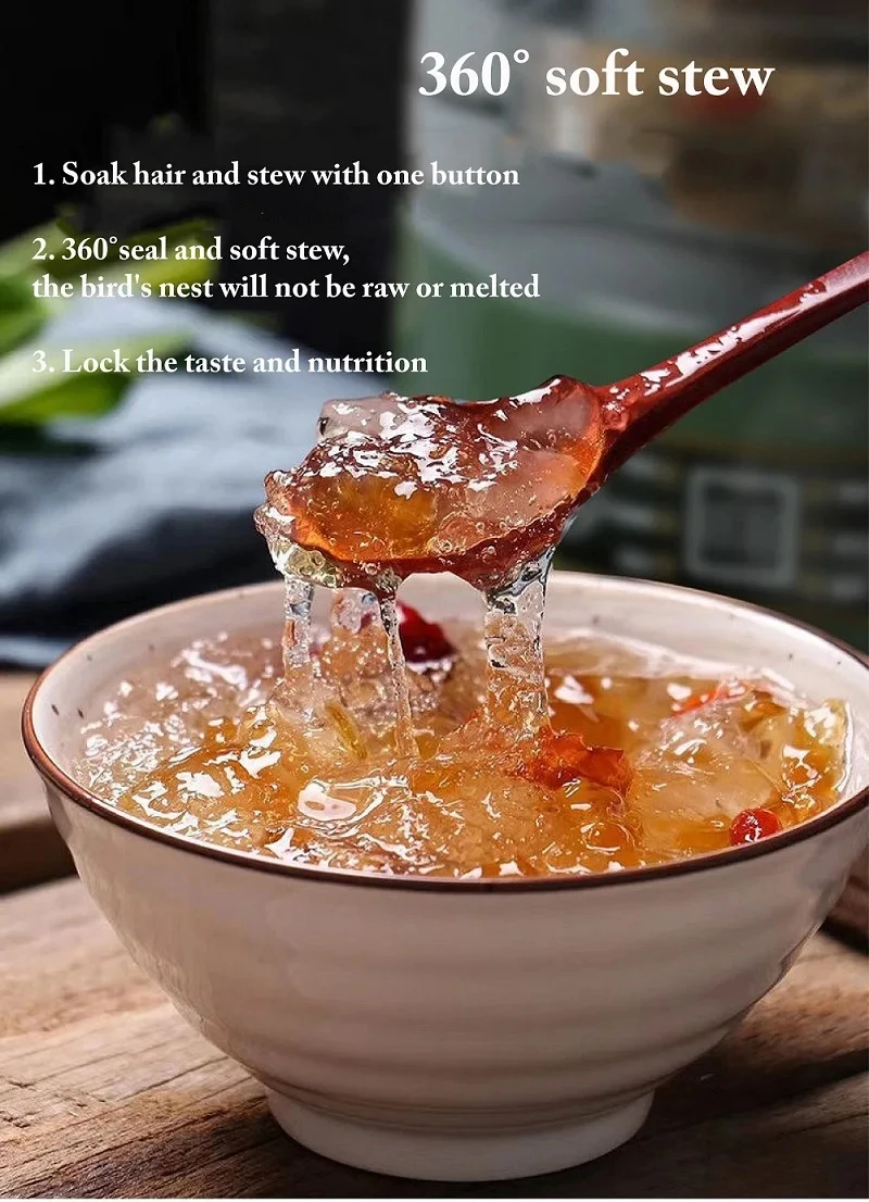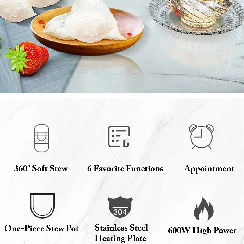 Function include: Bird’s Nest, Egg Custard, Dessert, Porridge, Soup, Keep Warm, Reservation, Timing