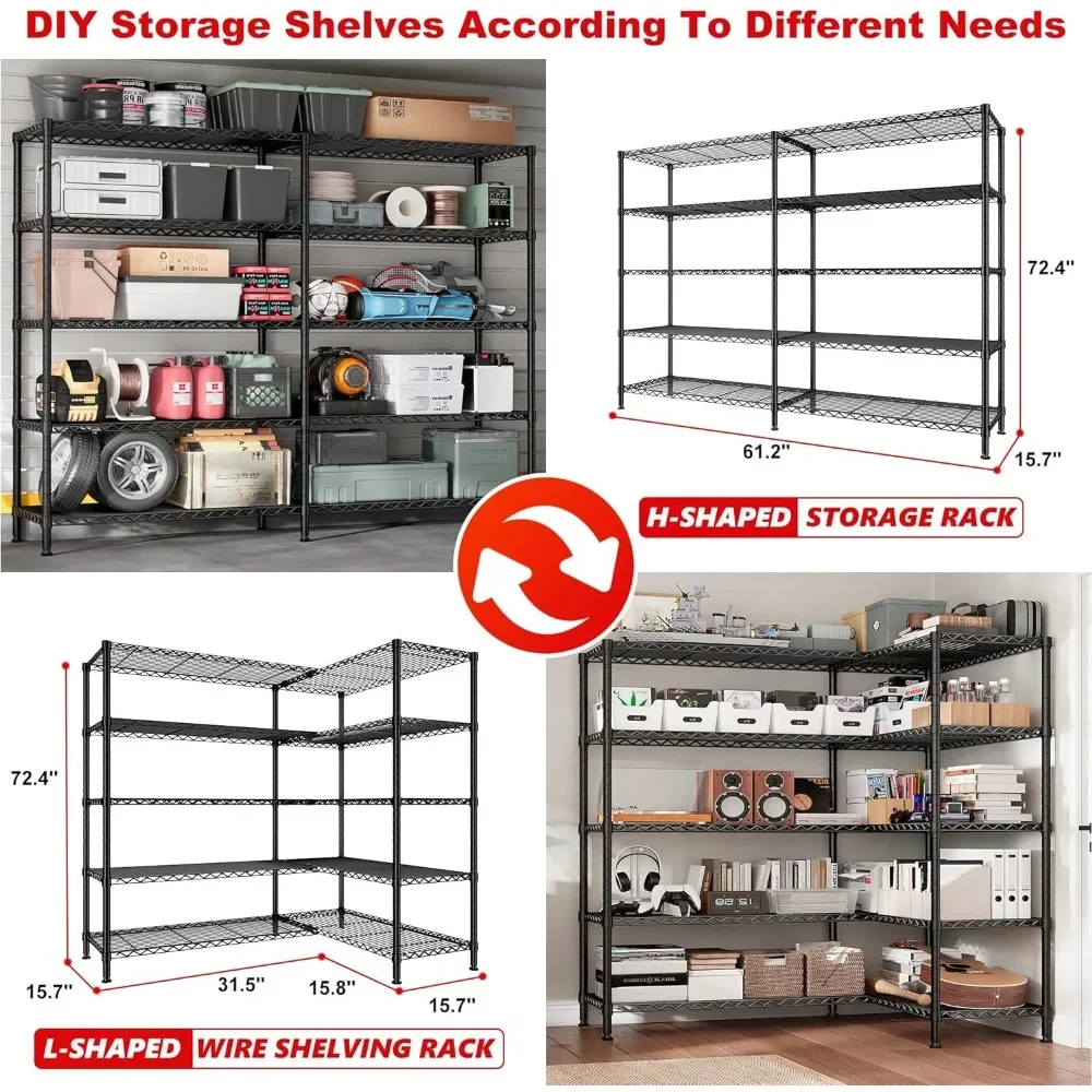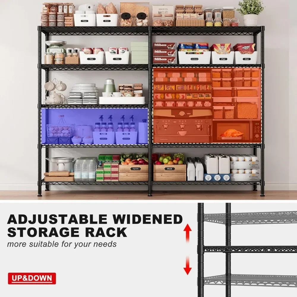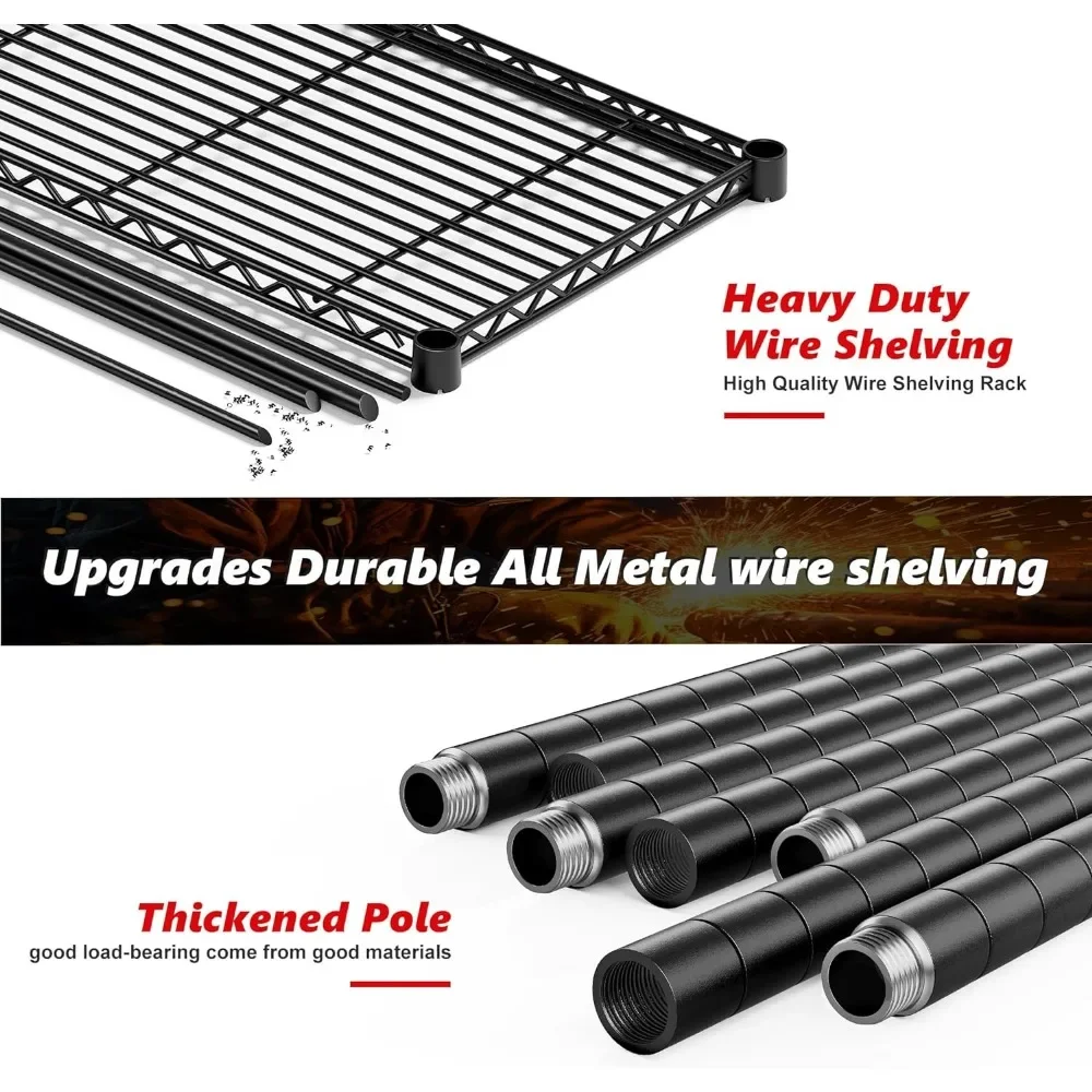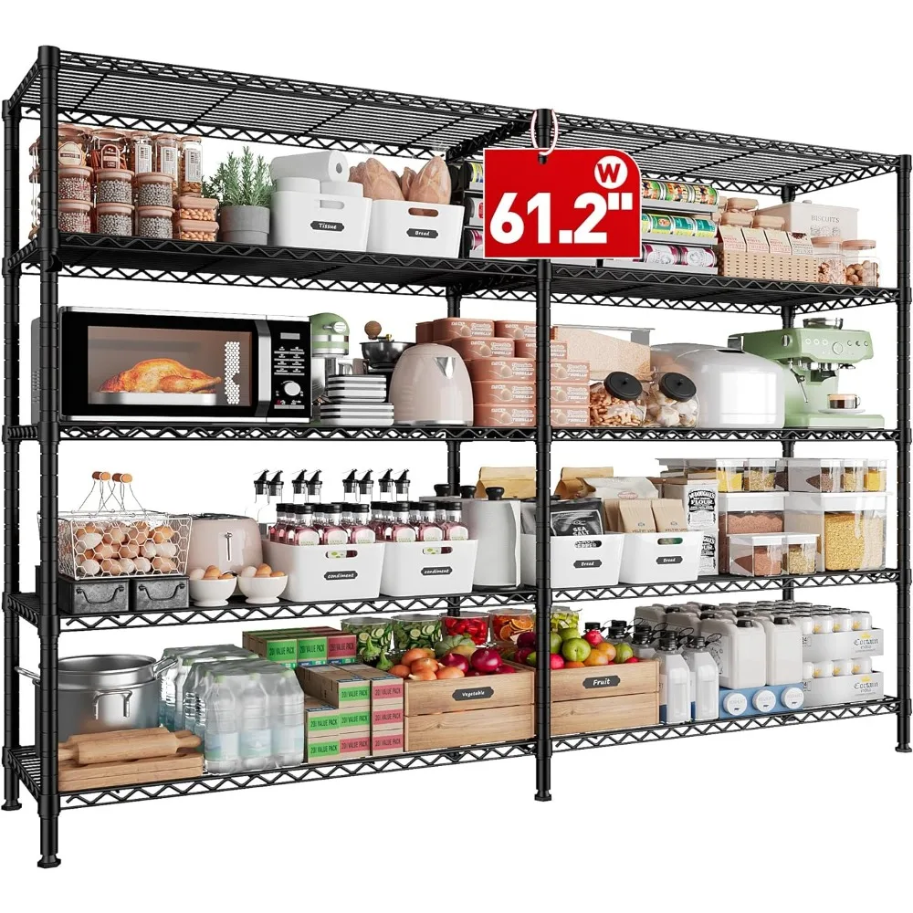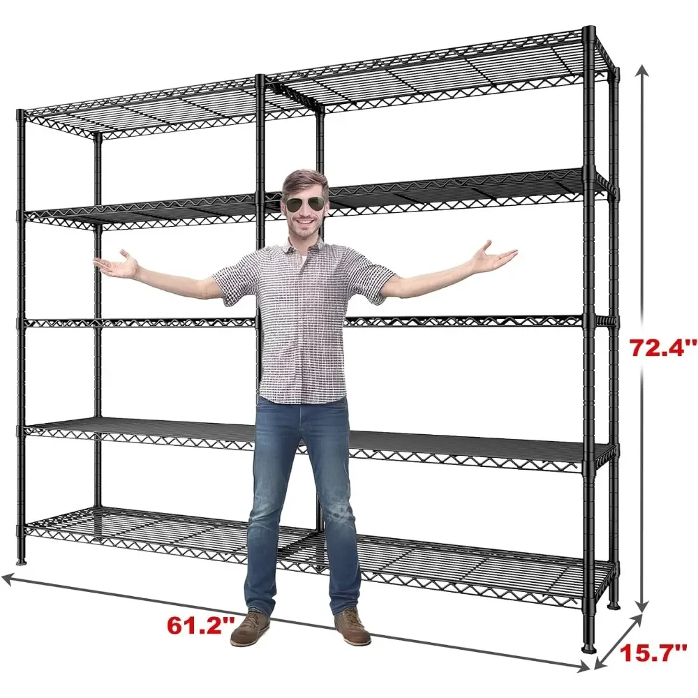 - 【61.2″W X72.4″H X 15.7″D Monster Size Wire Shelving Unit】The capacity of the 61.2”W storage shelves is twice that of the market shelves, easily meeting your storage needs.This extra wide wire shelving can not only be used as a personal metal shelves for storage in your home, but also as a commercial grade heavy-duty garage shelving in warehouses ,supermarket and more.Large storage rack provide more storage space.