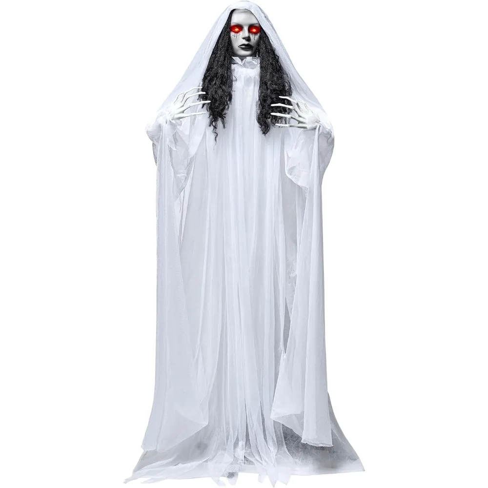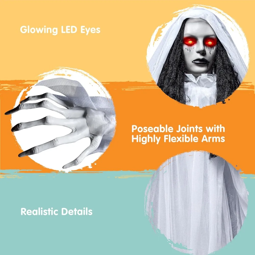 - Unleash the Thrills: Elevate your spooky Halloween decorations with our Animatronic Standing Bride Ghost! Whether indoors or outdoors, this prop delivers scares and delights that’ll make your Halloween display the talk of the town. Get ready to create a ghostly wedding scene that’ll leave everyone spellbound!
