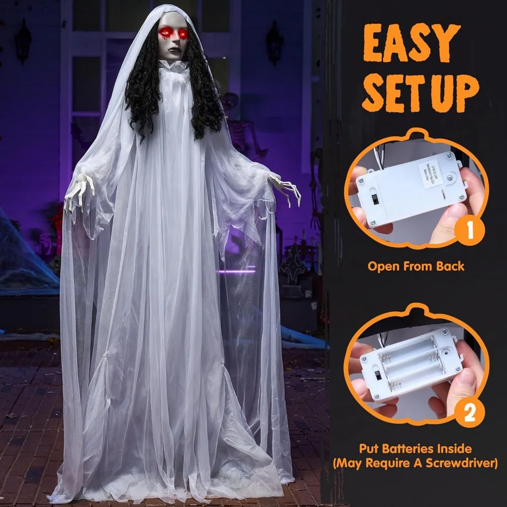 - Premium Quality and Easy to Set Up: Crafted from durable materials, our Bride Ghost prop is built to last, ensuring it remains a standout piece in your Halloween decor for years to come. Plus, it’s easy to set up, so you can focus on creating the ultimate haunted experience without any hassle. 3 AAA batteries required (NOT INCLUDED)