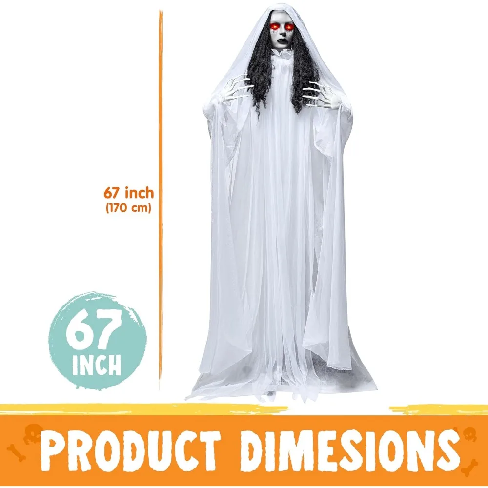 - Life-Size Prop: Standing at an eerie 67″ tall, this bride ghost is a realistic and scary Halloween prop that adds a haunting presence to your Halloween decorations. It’s the perfect centerpiece for your spooky setup!