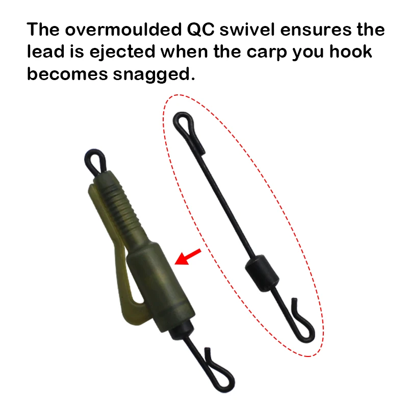 The design features an integrally moulded QC swivel ensuring the swivel can not pull free from its housing.The overmoulded QC swivel ensures the lead is ejected when the carp you hook becomes snagged.