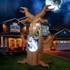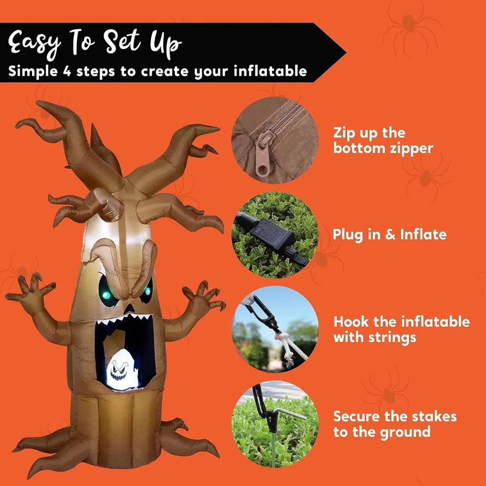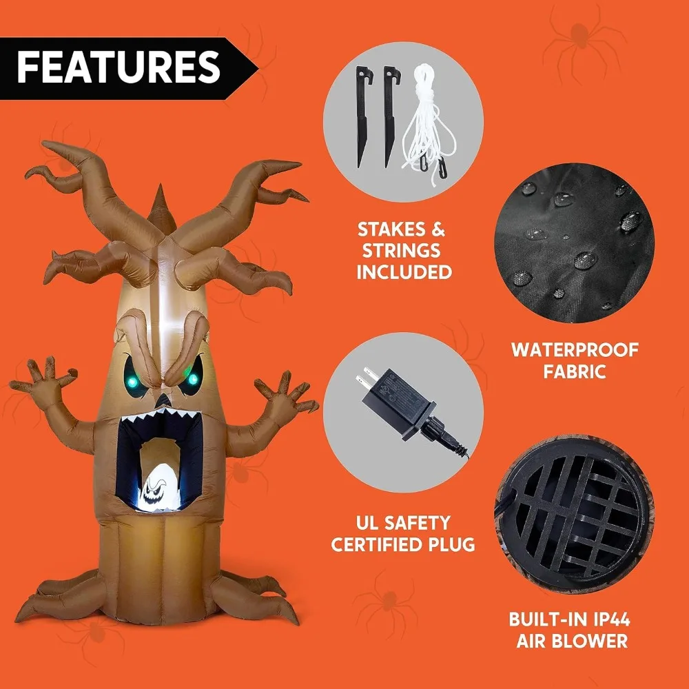 - Perfect Design. This 7ft Halloween inflatable tree with a swinging ghost and built-in LED lights is designed to add a touch of horror and spookiness to your outdoor decor. This inflatable comes with an extended cord, ground stakes, fastened ropes, built-in sandbags, and a plug with UL certification.