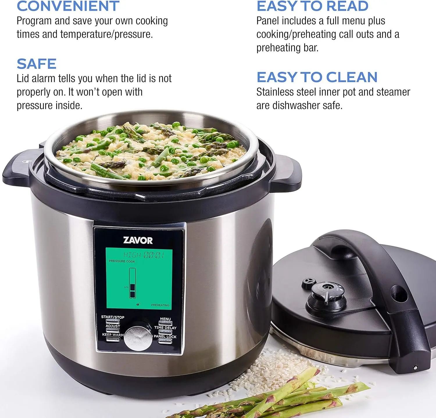 - Featured functions: pressure cook (High and low), slow cook (High and low), steam, brown, flex (that allows to sous vide), simmer, yogurt, grains, eggs, dessert, keep Warm and time delay to program cooking time at your convenience