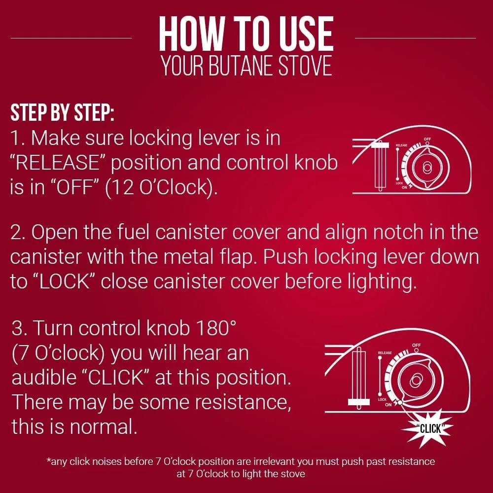 - PACKED WITH SAFETY FEATURES – This Butane Stove is packed with many essential safety features. It comes with an In-Line Regulator with Pressure-Sensing Shut-Off. If the pressure gets too high, the regulator will shut off flow to prevent dangerous flashbacks. The Butane Burner has a wind-guard to protect the flame from breeze or A/C.