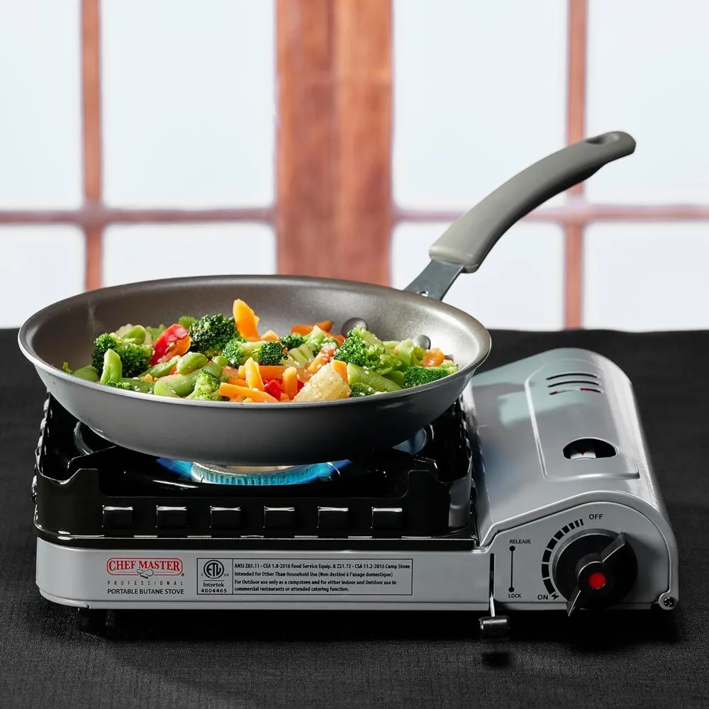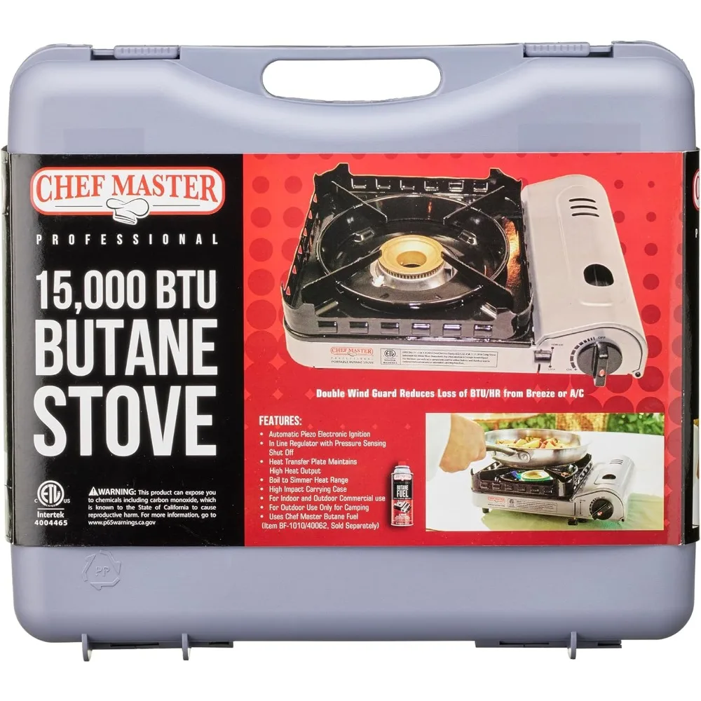 - CAMPING AND BACKPACKING ESSENTIALS – The Chef Master 15,000 BTU Portable Butane Camping Stove is essential for any camping or backpacking trip. This butane stove has a hard-shell carrying case which means that this unit is extra portable! The stove is small enough to easily fit in a hiking backpack or in a camping bag