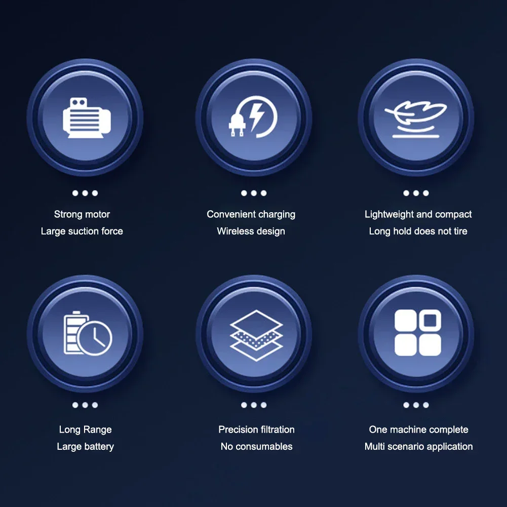 1. Motor poderoso e projeto leve:Este aspirador de carro apresenta um motor potente que proporciona uma sucção impressionante, mantendo um design leve. Ele suga sem esforço poeira e pêlos de animais teimosos, tornando-o perfeito para manter seu carro limpo. O design sem fio garante manobrabilidade conveniente, permitindo que até mesmo as crianças se agarrem e limpem facilmente com ele.