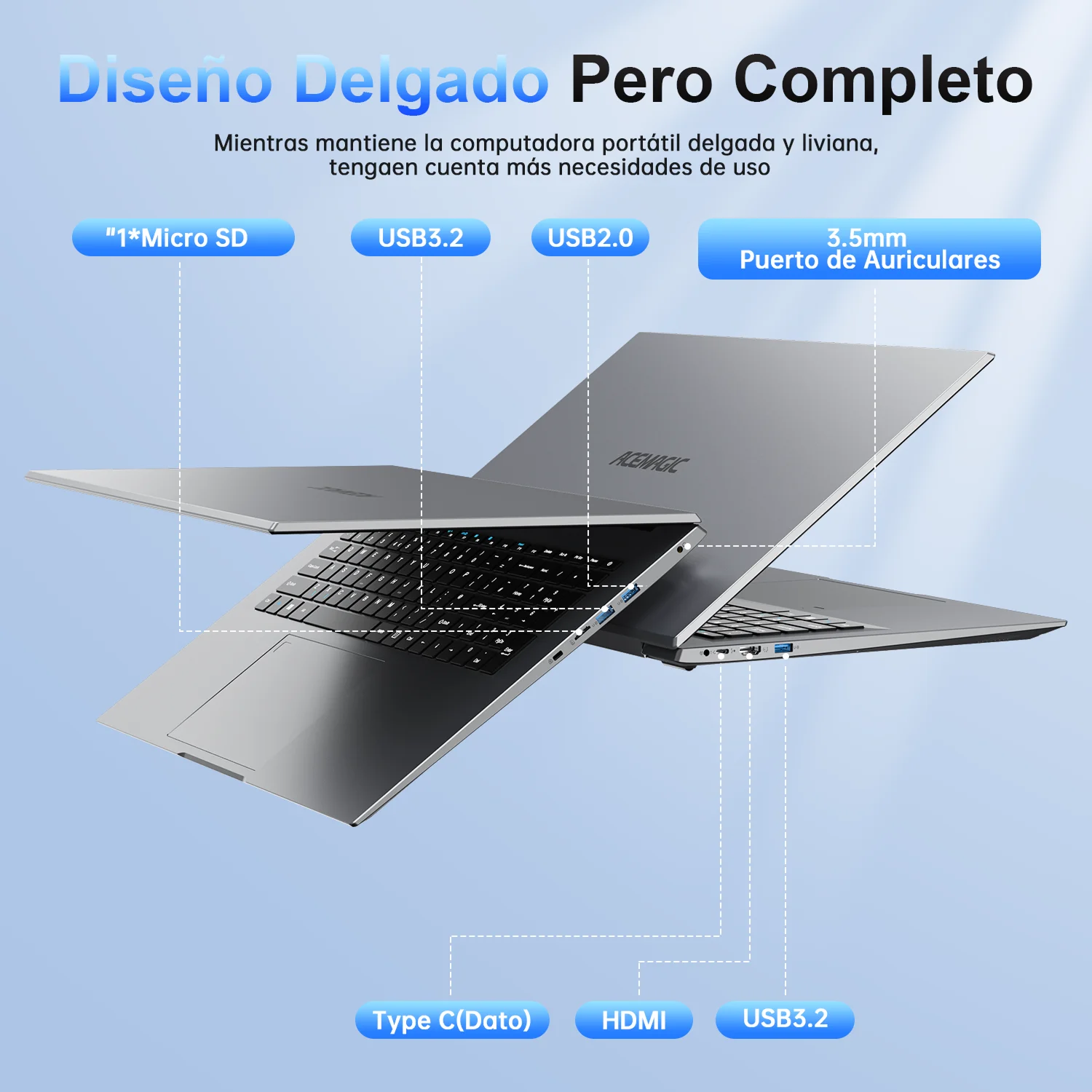 This laptop features a “Diseño Delgado Pero Completo” (Slim Yet Complete Design). While keeping the laptop slim and lightweight, it caters to more usage needs with a variety of ports: 1*Micro SD, USB3.2, USB2.0, 3.5mm headphone port, Type C (Data), HDMI, and another USB3.2. Whether you need to transfer data, connect to external devices, or enjoy audio, it has you covered, making it an all – in – one portable solution.