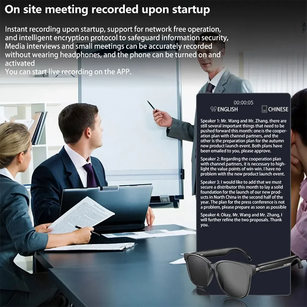 3.Real-Time Multilingual Translation: Engage in cross-language communication with audio glasses offering real-time translations. Enhance business interactions with swift and seamless dialogue exchanges.