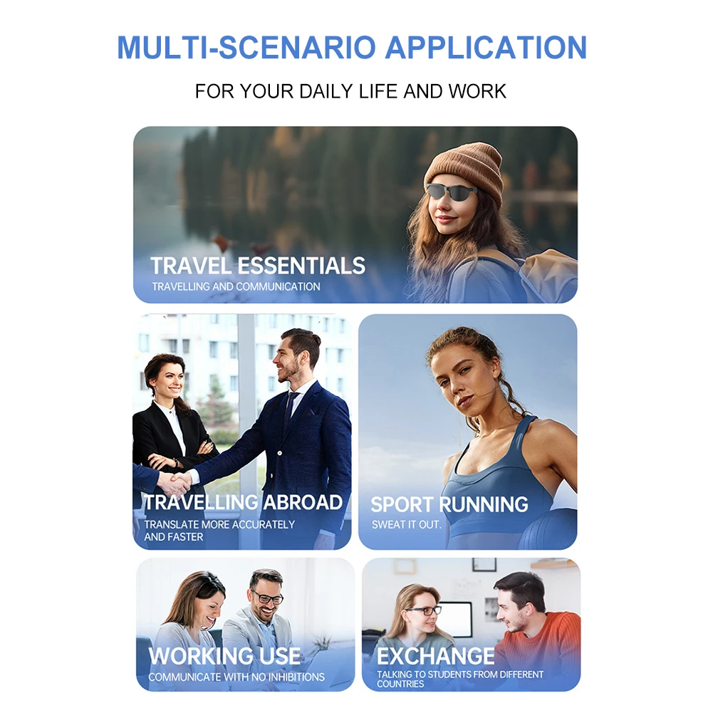 Feature: 1.Real-Time Translation in 144 Languages: Experience seamless communication with support for 144 languages, achieving a remarkable 99% accuracy rate. Be it for sports driving sunglasses or any other activity, exchange words with confidence across global regions. 2.Bluetooth-Compatible 5.4 Technology: Featuring bluetooth-compatible 5.4, enjoy smooth audio streaming. Smartly integrates for iPhone and for Android devices as smart glasses, ensuring fast and stable connections without interruptions. 3.High-Definition Calls: Equipped with HD microphone and speakers, these earphone glasses provide clarity in calls, enhancing your communication experience. Effortlessly manage calls and music via built-in mic and headphones without extra gadgets. 4.Blue Light Eye Protection: Incorporating blue light filtering, these wireless sunglasses reduce eye strain from prolonged device use. Designed for comfort with a lightweight frame, making them ideal for daily wear. 5.Versatile Use: for music, calls, gaming, TV, home office, or outdoor activities, these wireless headphones adapt to various scenarios. Let these multifunctional glasses be your smart life and work assistant. Specification: