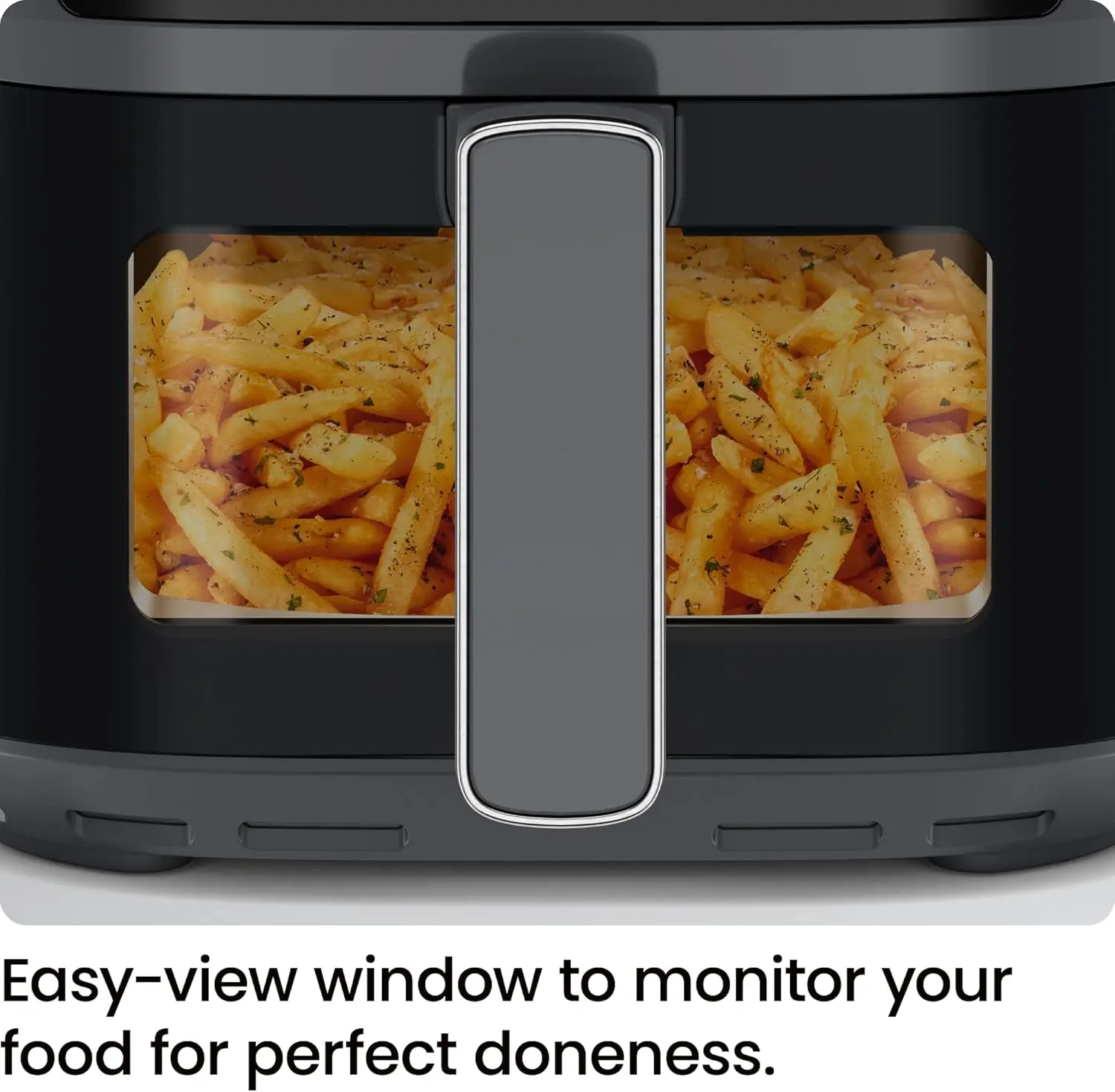 - EASY-VIEW WINDOW: Watch your food fry to your ideal finish. The integrated cooking window on the basket ensures that you can see just how crispy your food gets with only a fraction of the cooking oil.