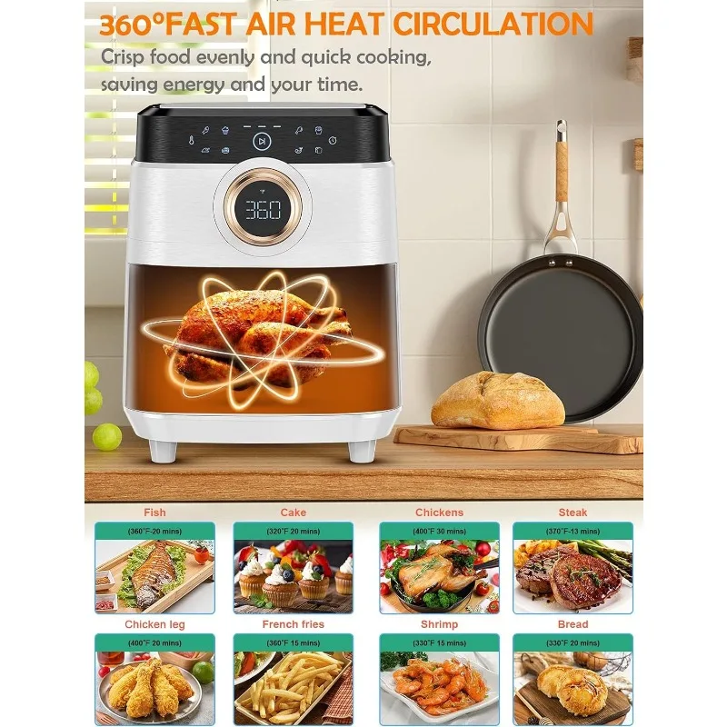 - OIL-FREE AND THE PERFECT CRISP: This Air Frier Cooker Combines 5 Circle Powerful Heating Tubes with 360° Hot Air Circulation Technology to Ensure All Meals Cooked Evenly. It Ensure the Crispness of French Fries and Juiciness of Meat, and the Oil is Reduced by 85%. Perfect Gifts for Family and Friends.