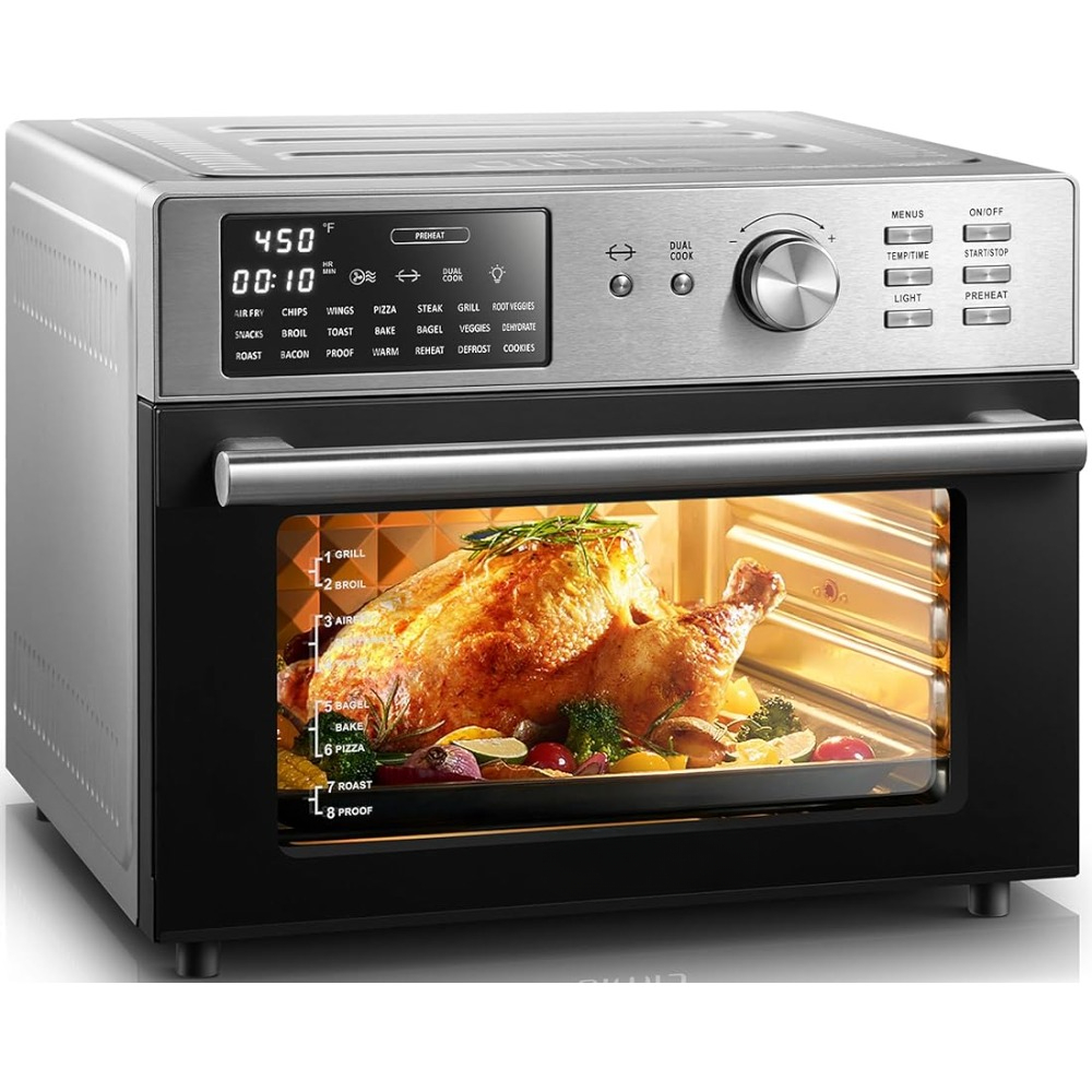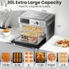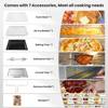 This stainless steel toaster oven features a large 32QT capacity and 6 basic accessories, with 4 layers of cooking positions that can accommodate 13 inches of pizza (on parchment), 4-6 pieces of toast or entire cake/pie, and 7.7 pounds of roasted chicken. Including food safety level 6 basic accessories and 1 recipe, it can meet all your cooking needs.
