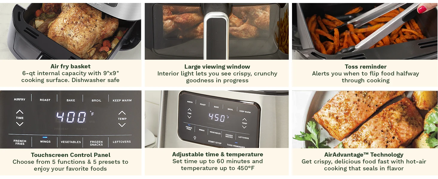 Cook everything from simple snacks to main meals with the versatile Cuisinart® Basket Air Fryer. This countertop cooker lightens up fried foods with fast and even hot-air-powered cooking – using little or no oil – for making healthy meals with the crispy crunch you love. Five popular pre-programmed settings, a toss notification to flip food mid-way through cooking, and convenient viewing window make it easy to air fry, roast, bake, broil, and warm food with delicious results every time. Lighten up your menu with the convenient air fryer that does more for mealtime!