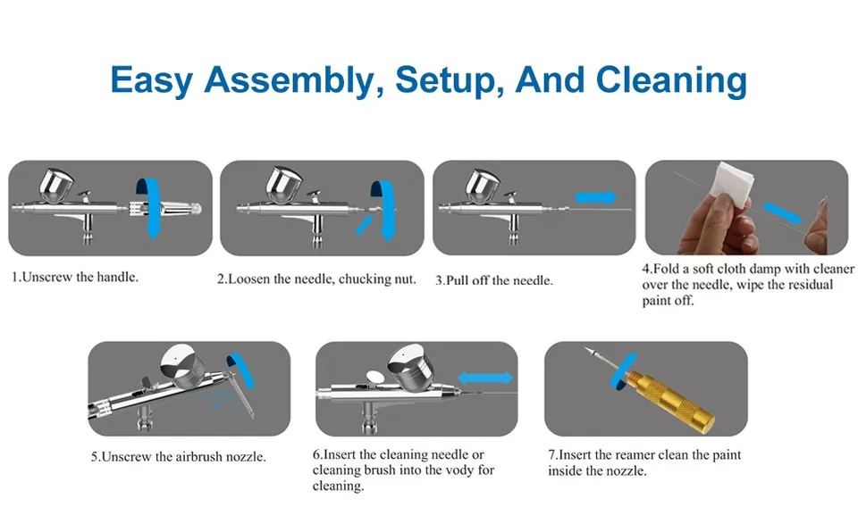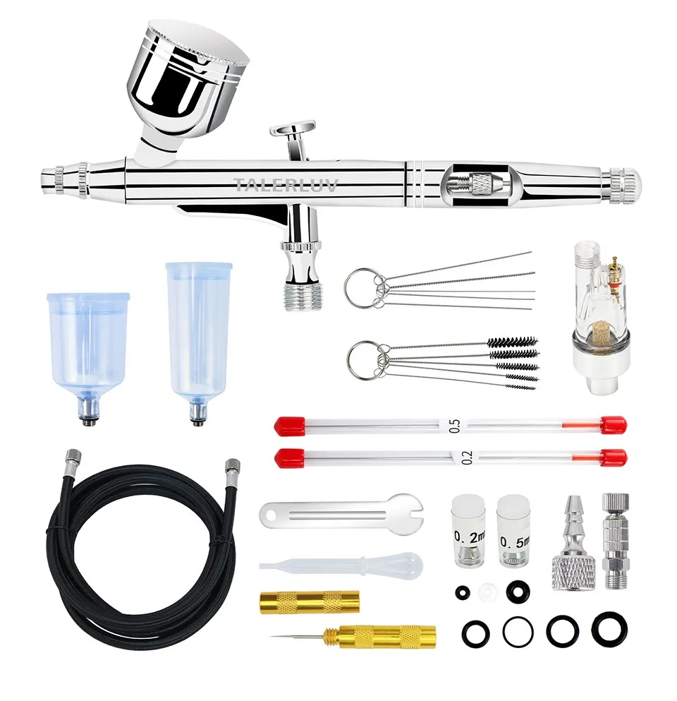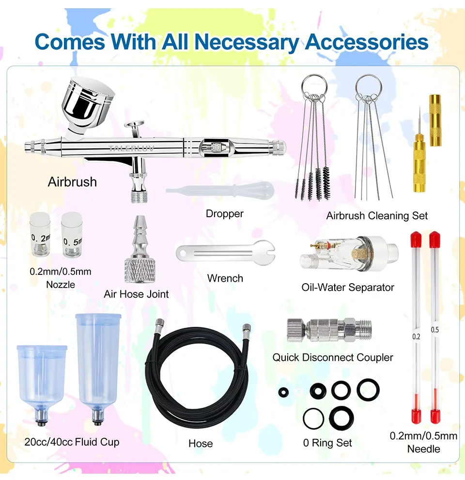 Include a air hose, dual-action gravity feed airbrush, mini air filter, a holder, nozzle spanner and dropper.