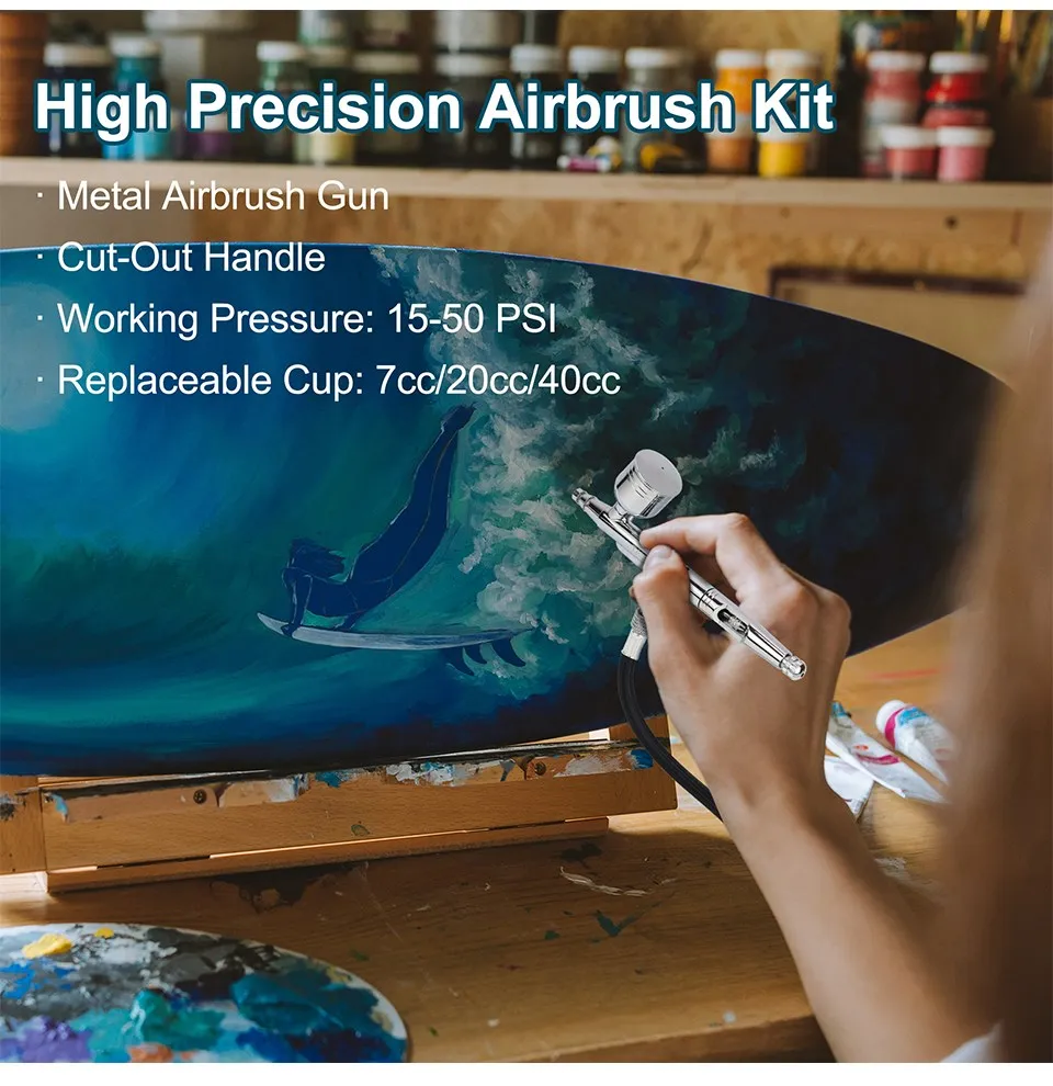 This professional airbrush air compressor kit set is widely used in model making, cake decorating, tattoos, nail art, etc. Perfect for artwork, nail art beauty, body art, design painting, model painting, cake decoration, craft, models and fine art such as car painting illustration, textile and t-shirt painting.