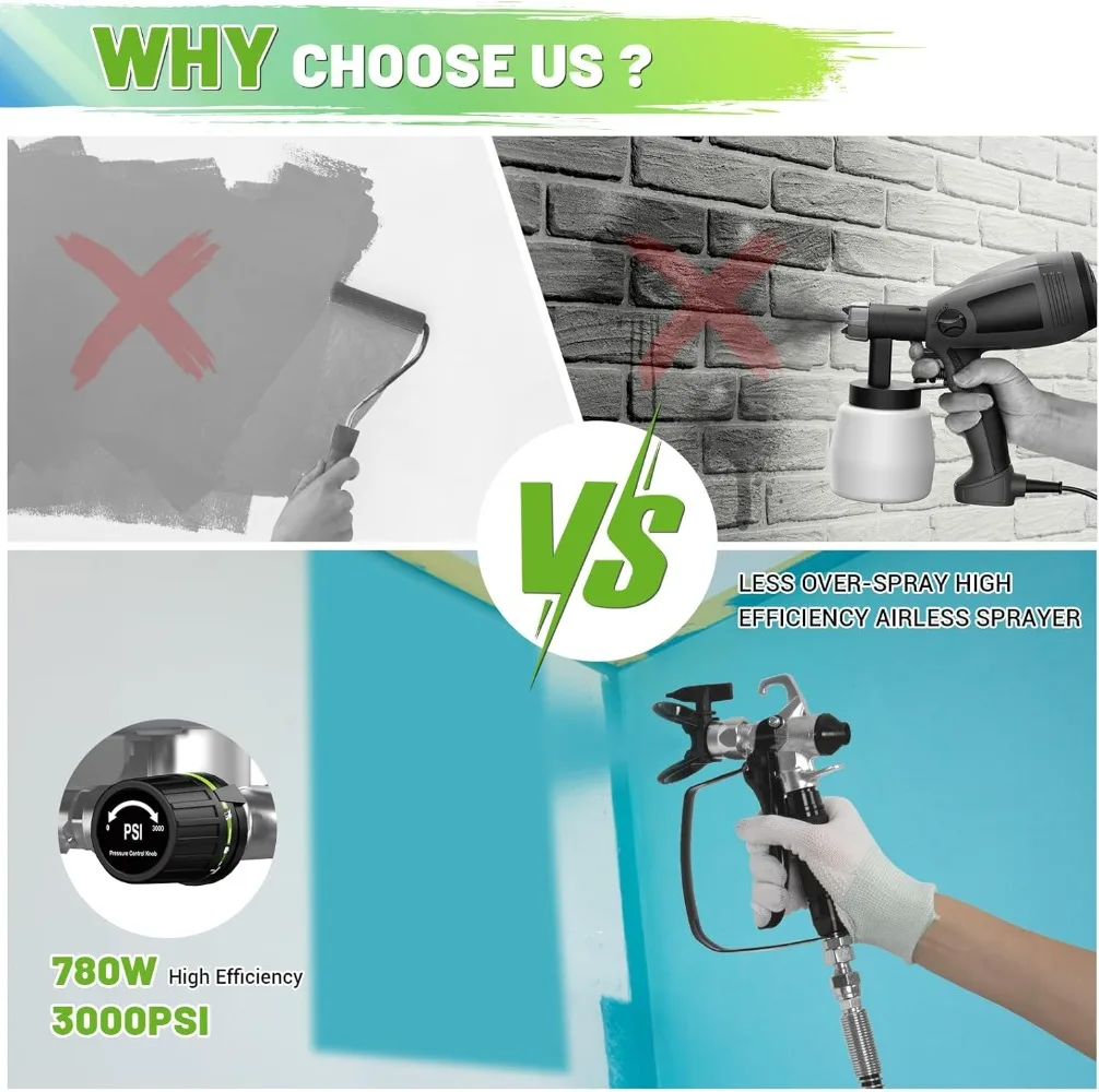 - 【Powerful Airless Stand Paint Sprayer】 780W High speed motor, 1.1L/Min max flow, 5X faster than rollers with low over-spray, getting the paint go much quicker and finer. Great paint sprayer for house painting. TRY IT SOONER, MAKE LIFE BETTER!!