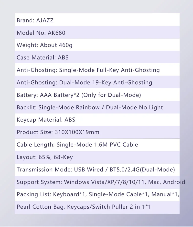 Supported systems: Windows Vista/XP/7/8/10/11, Mac, Android Packaging list: keyboard * 1, single-mode data cable * 1, instruction manual * 1, pearl cotton bagKey puller/shaft puller 2-in-1 * 1