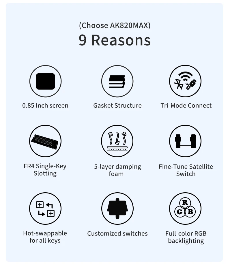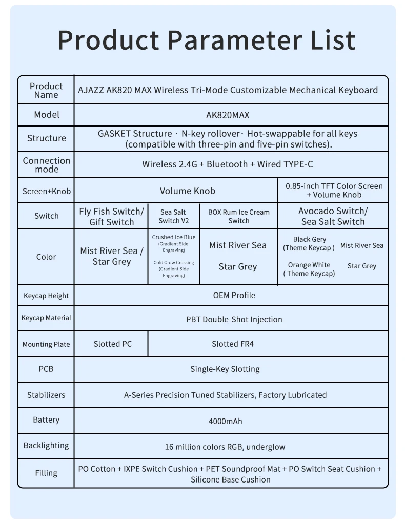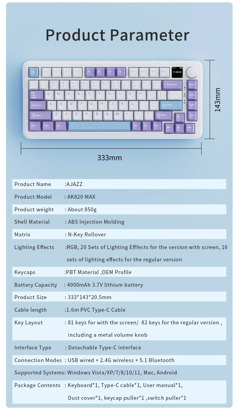 Ajazz AK820MAX Mechanical keyboard With TFT Colour Screen BT5.1/2.4G/Type-C Tri-Mode RGB Backlit Hot Swappable Gaming Keyboard