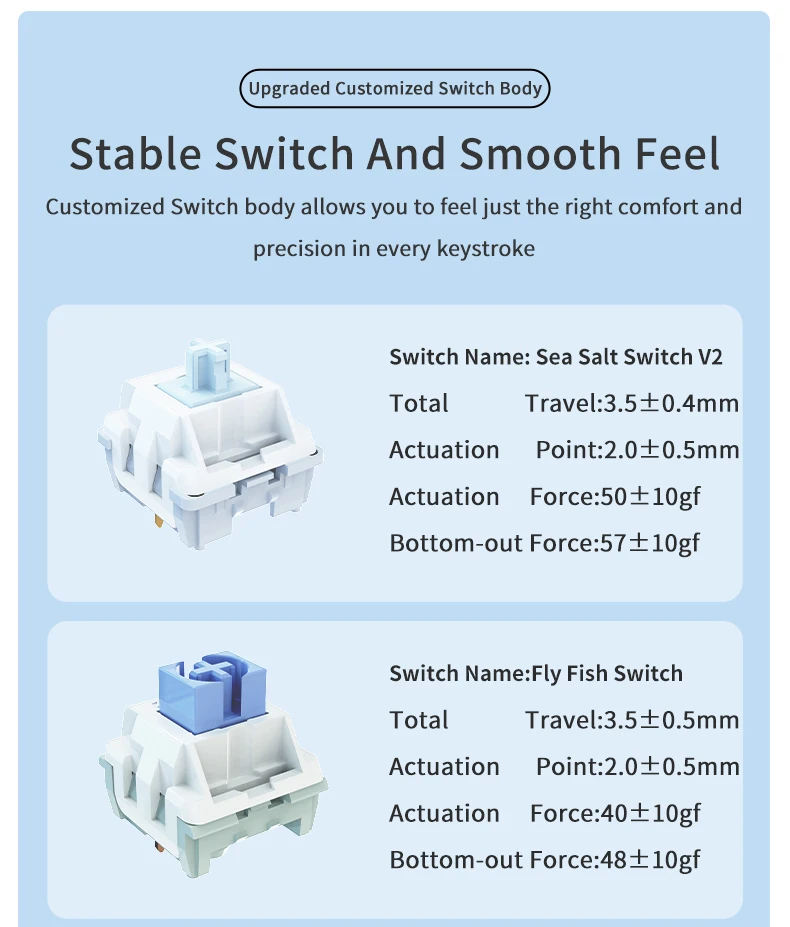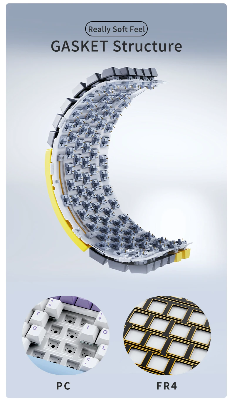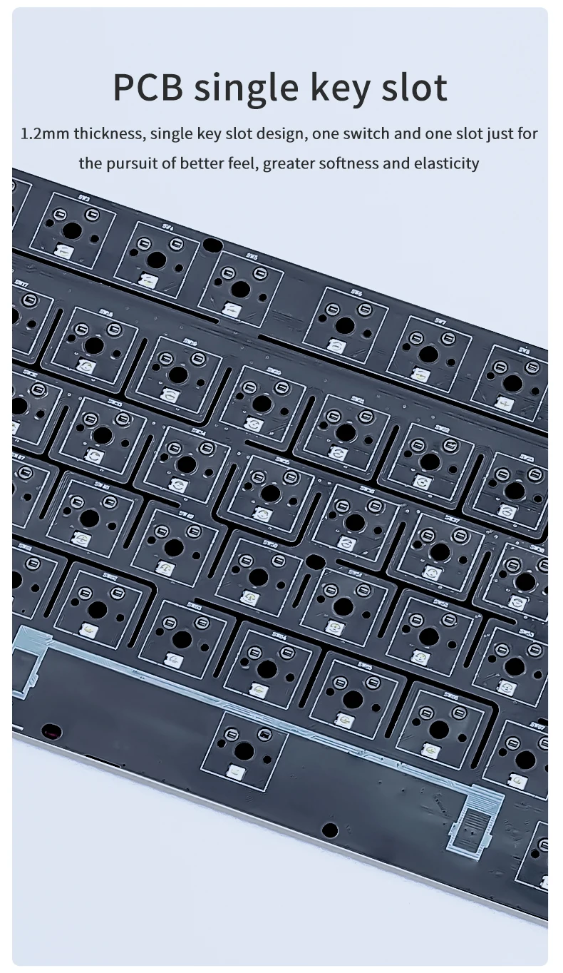 ・PCB Single Key Slot:1.2mm thickness, single key slot design, one switch and one slot just forthe pursuit of better feel, greater softness and elasticity.