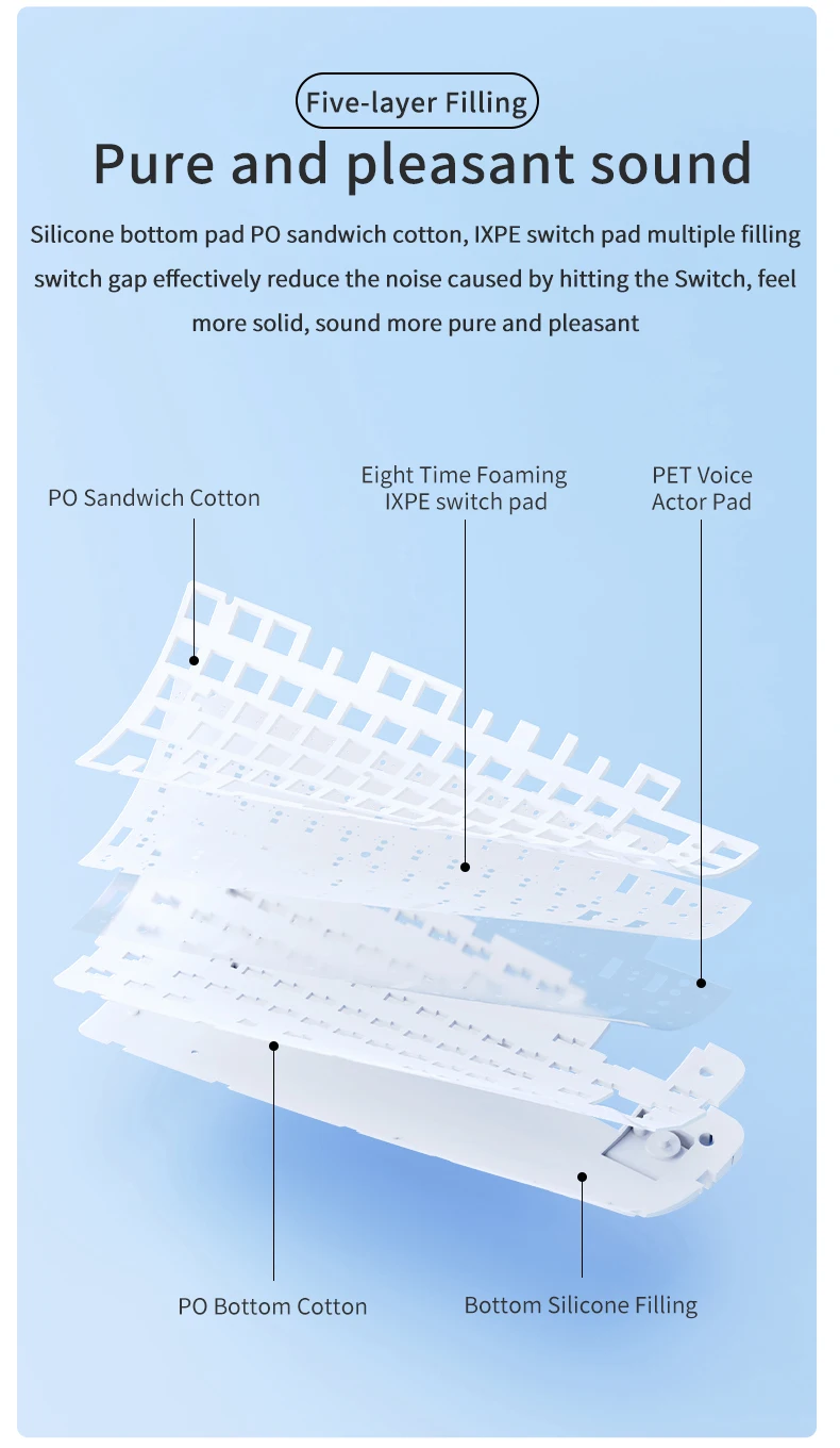 ・Pure and Pleasant Sound:Silicone bottom pad PO sandwich cotton, lXPE switch pad multiple fillingswitch gap effectively reduce the noise caused by hitting the Switch, feelmore solid, sound more pure and pleasant.