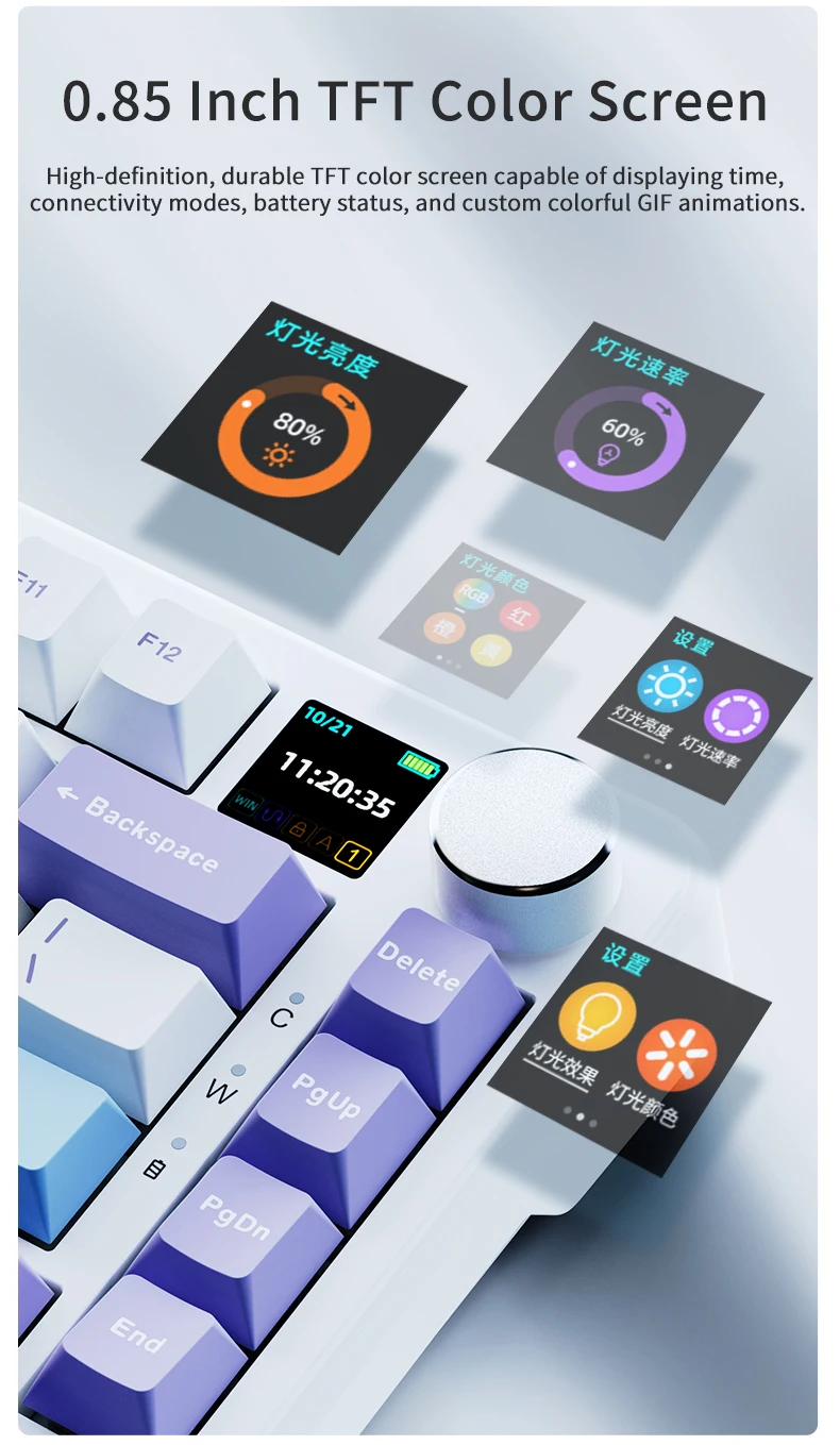 ・0.85 lnch TFT Color Screen:High-definition, durable TFT color screen capable of displaying time,connectivity modes, battery status, and custom colorful GlF animations.