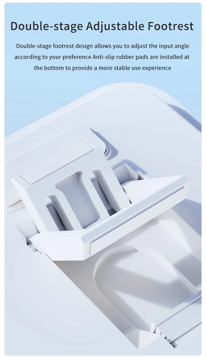 ・Double-stage Adjustable Footrest:Double-stage footrest design allows you to adjust the input angleaccording to your preference Anti-slip rubber pads are installed atthe bottom to provide a more stable use experience.