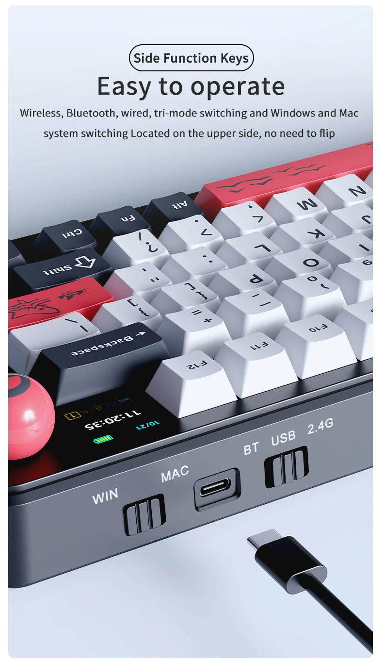 ・Side Function Keys:Wireless, Bluetooth, wired, tri-mode switching and Windows and Macsystem switching Located on the upper side, no need to flip.