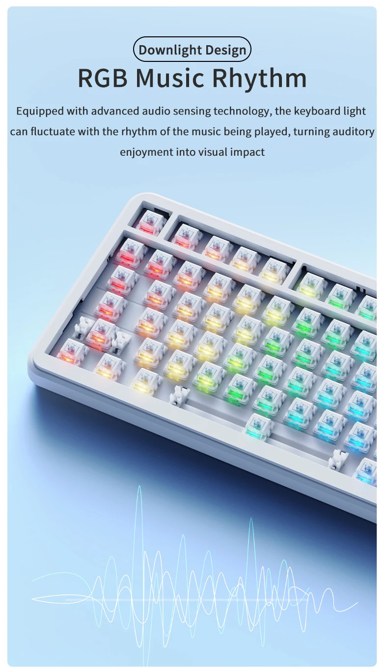 ・RGB Music Rhythm:Equipped with advanced audio sensing technology, the keyboard lightcan fluctuate with the rhythm of the music being played, turning auditory enjoyment into visual impact.