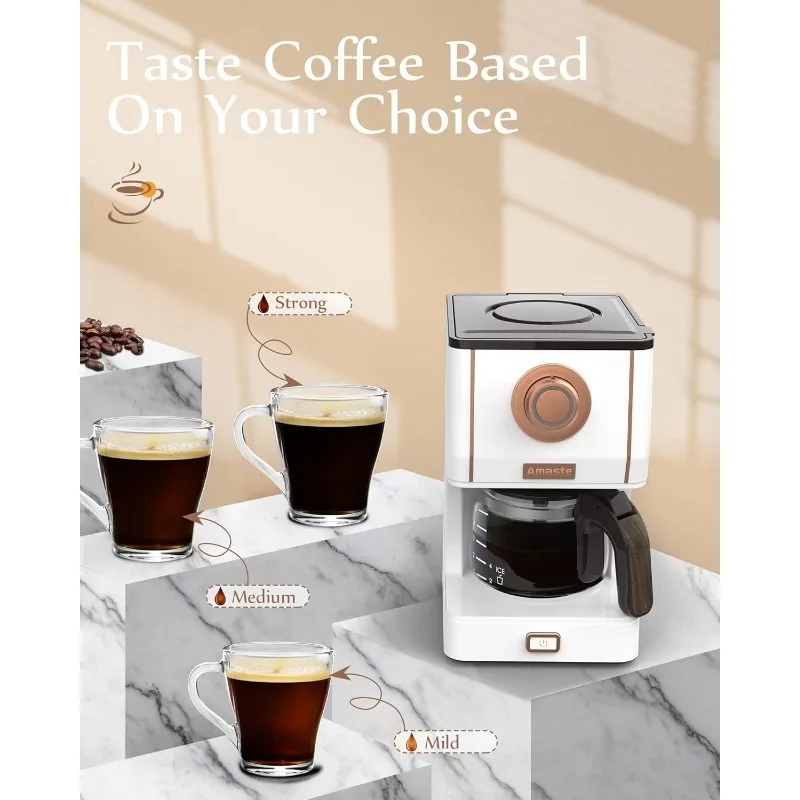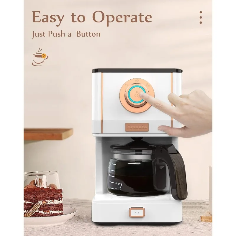 - THIS IS DEFINITELY AN ESSENTIAL ART PIECE FOR YOUR DELICATE LIFE. AMASTE Retro Style Coffee Machine with Glass coffee pot with a classy design, it can perfectly ornament your kitchen, living room, and office. This Coffee Maker enables you to enjoy your favorite kinds of coffee such as cappuccinos and lattes. Also, the drip coffee machine doesn’t hog too much space with the size of 6.3”*7.8”*10.8”, so you are able to carry it to any place.