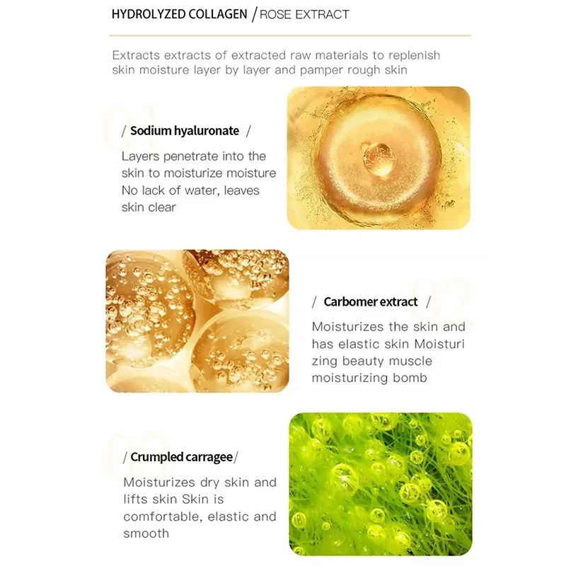 Containing collagen and other skin care ingredients, it hydrates and moisturizes dry and rough skin, moisturizes and tender skin, refreshes and locks water, and makes skin full and moist, soft and delicate.