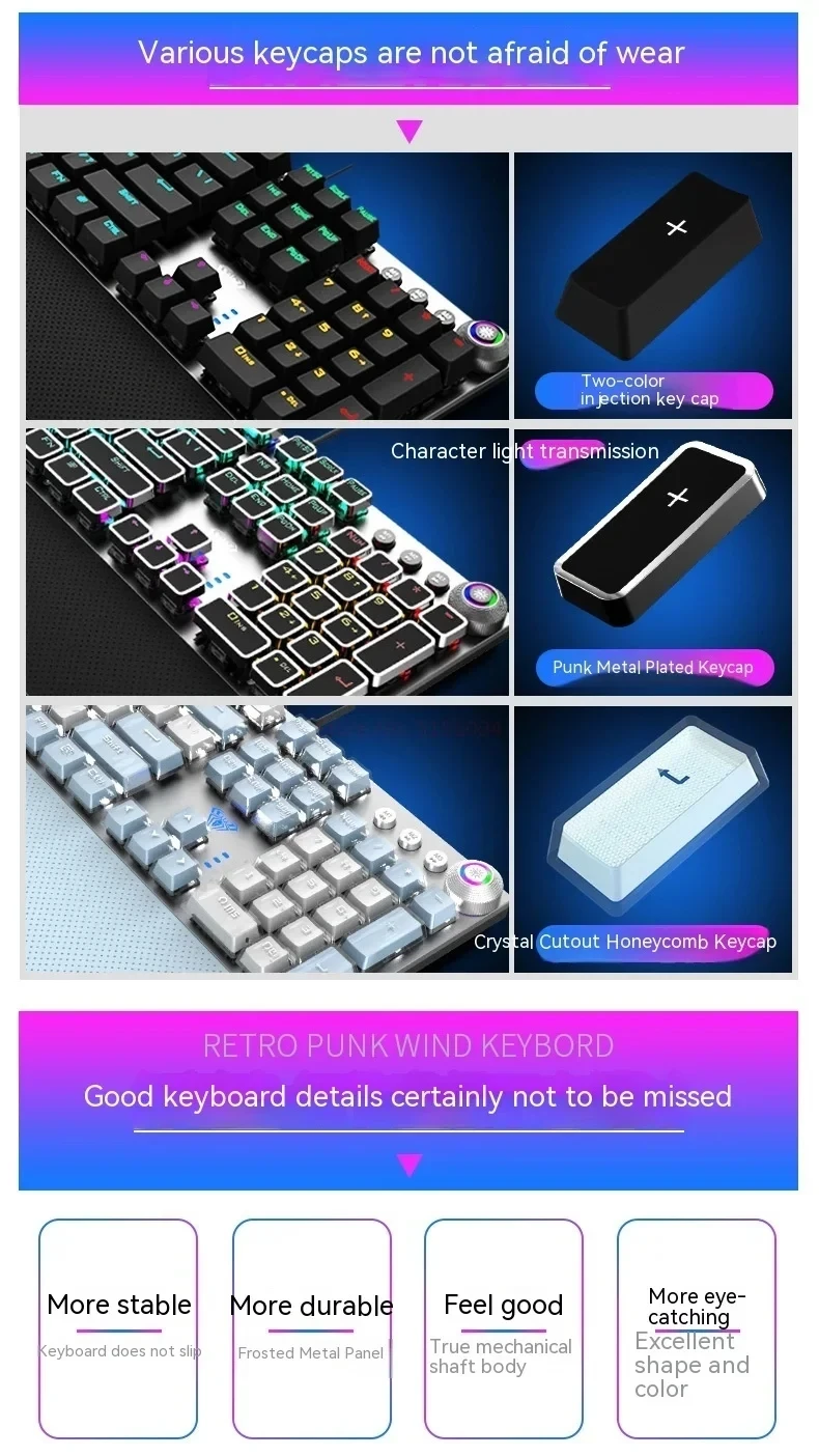 • Punk Keycap Design :Stand out from the crowd with the keyboard’s punk keycap design, adding a retro touch to your gaming setup.