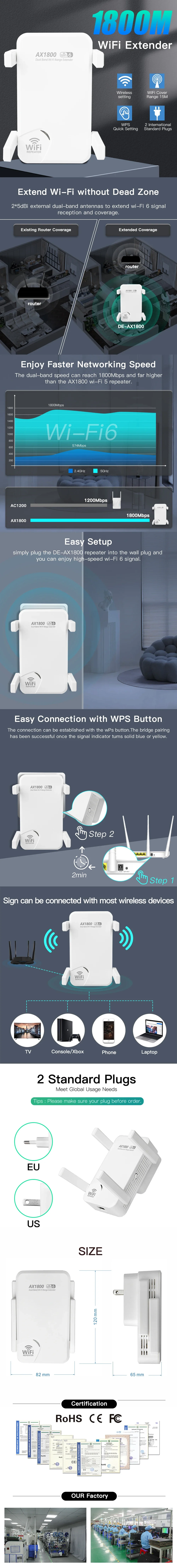 AX1800 Dual Band WiFi 6 Repeater 2.4G/5GHz Wireless Signal Booster Extender 1800Mbps with EU/US Plug for Network Coverage