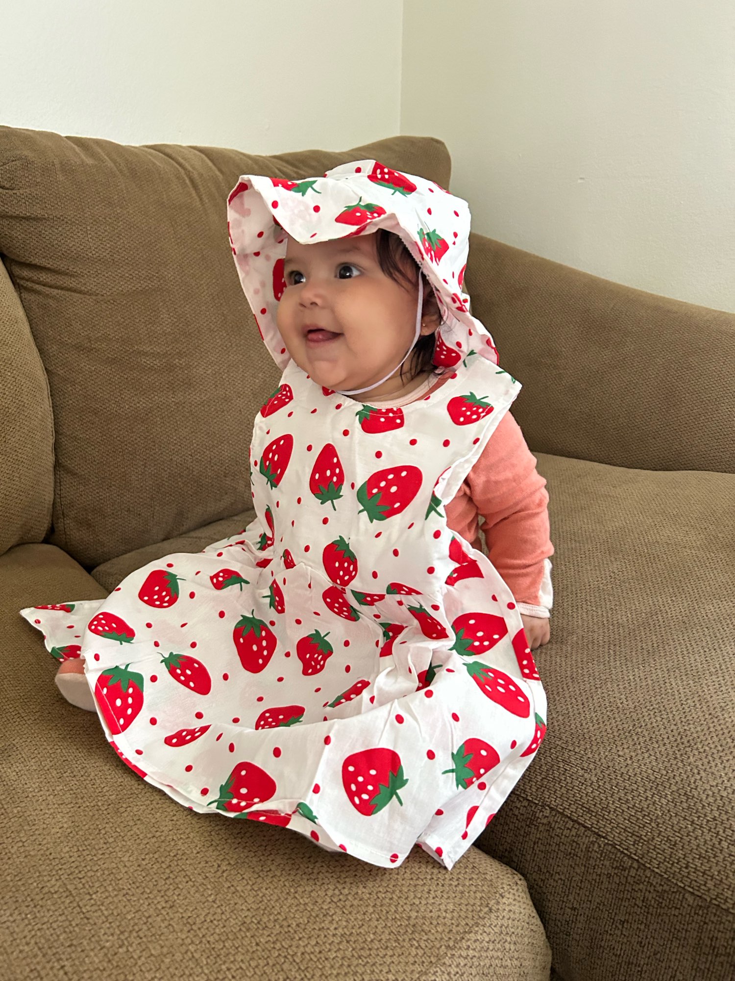 The Fabris feels fresh good for the summer. My baby is 7 months old .. but she a big girl and this was a little big. It says size 10 so 10 is for a 18 month old baby. But over all I love it .. I’ll continue ordering from this seller.