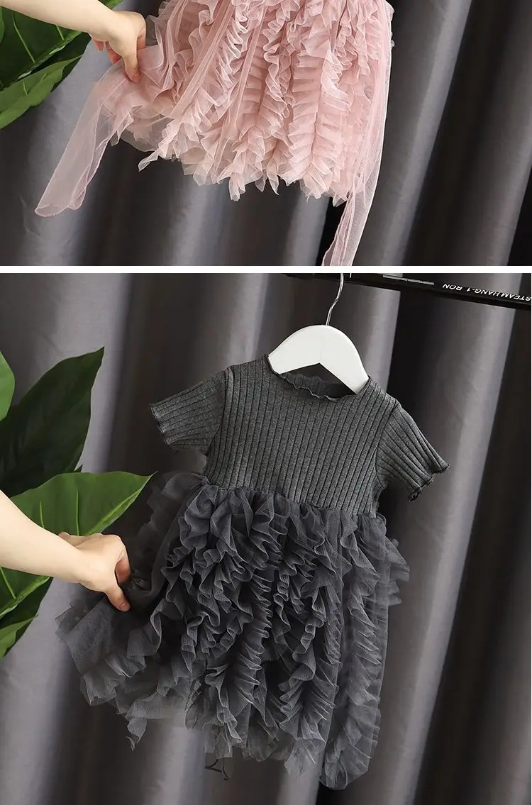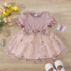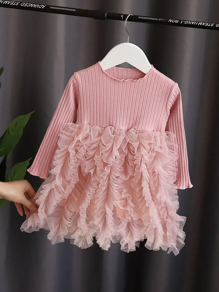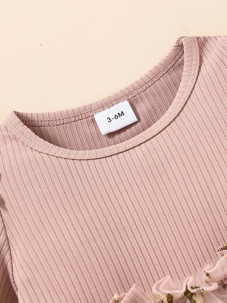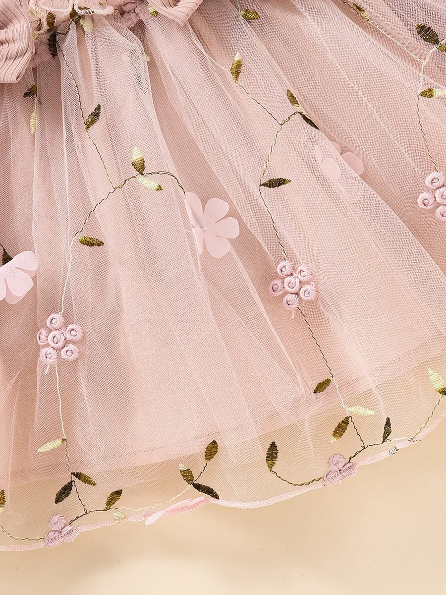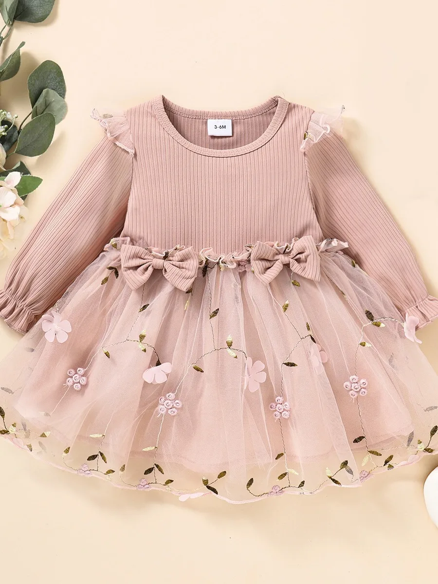 Baby Girl Pink Ribbed Long-Sleeve Bowknot Floral Embroidered Mesh Dress Perfect For Outings And Daily Wear