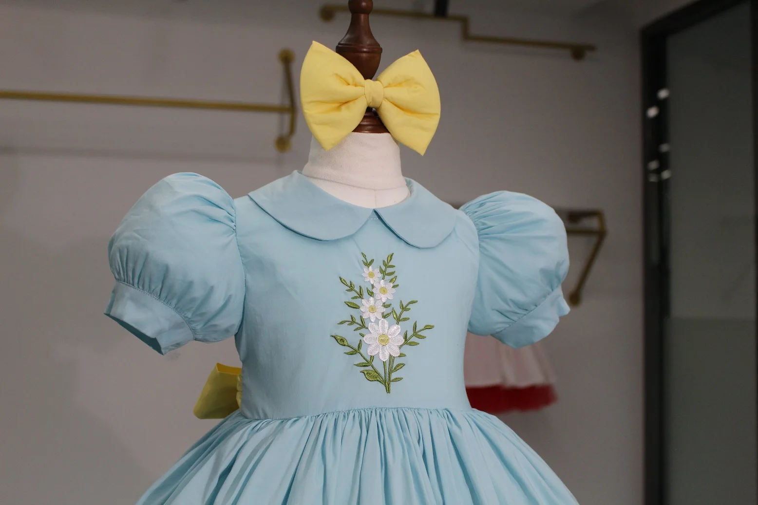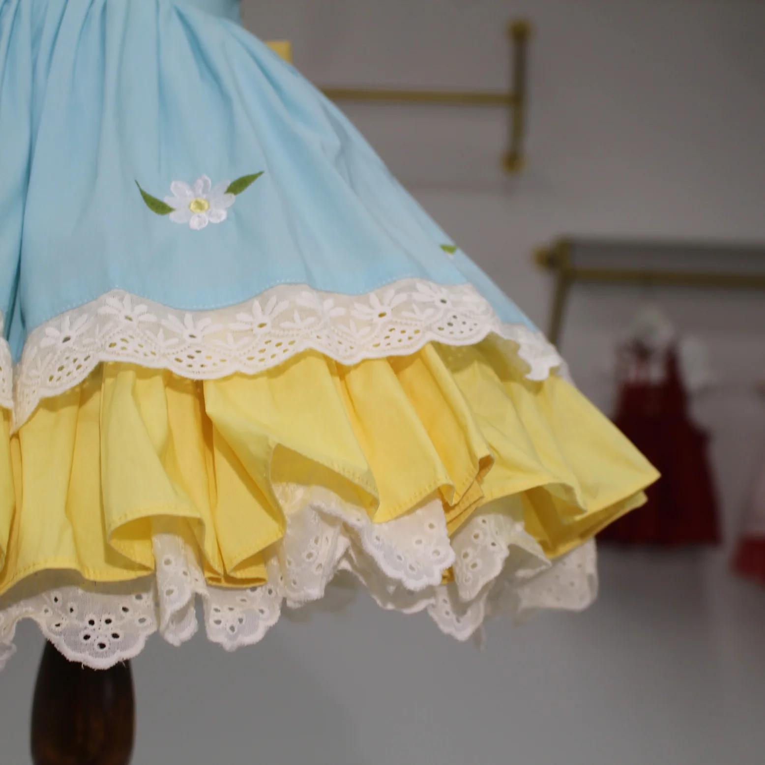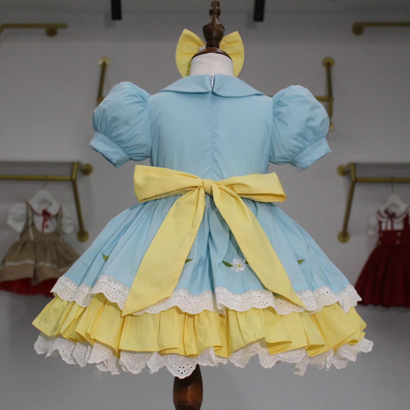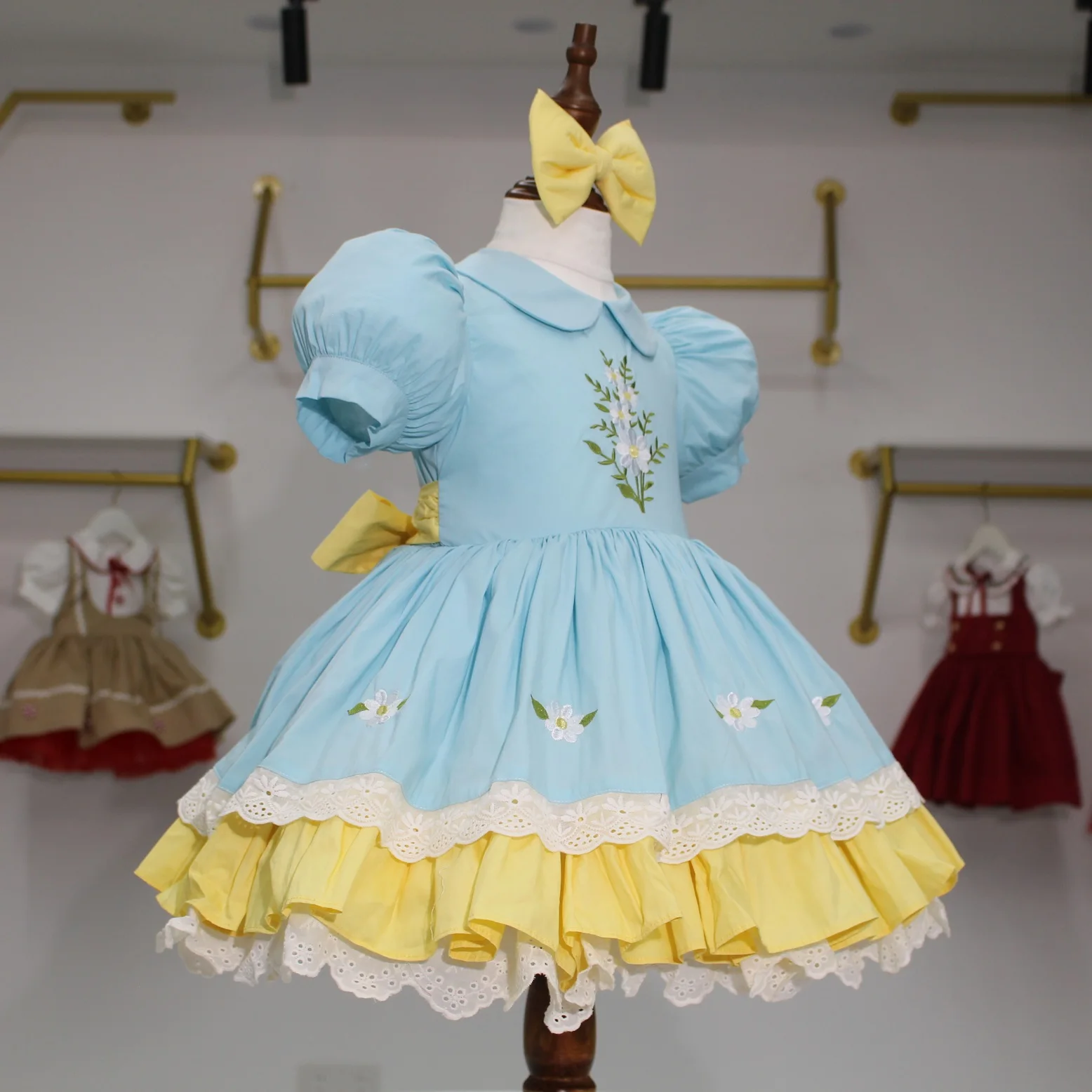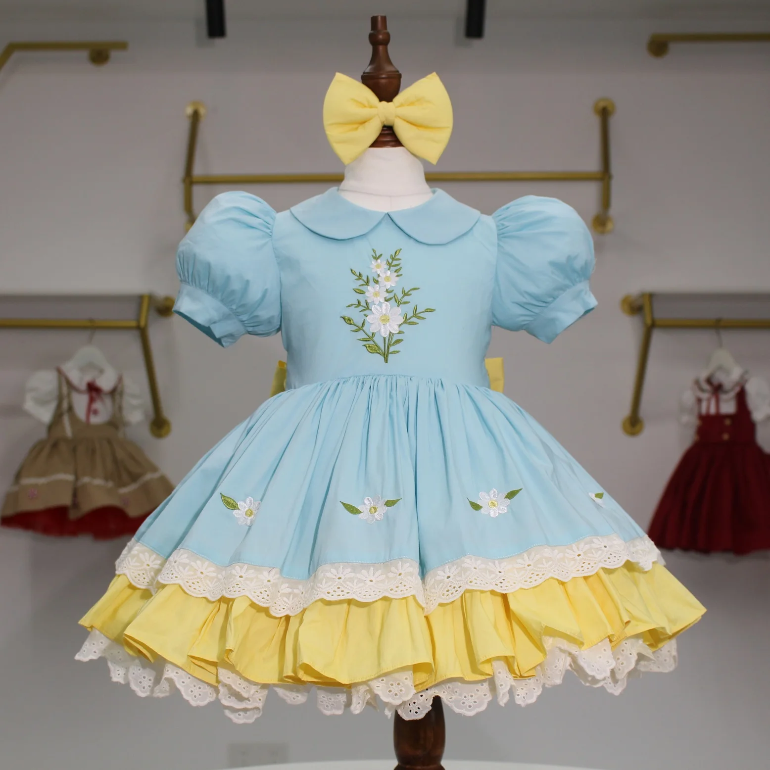 Baby Girl Summer Blue Yellow Daisy Embroidery Turkish Vintage Princess Dress for Birthday Holiday Easter Photography Eid B222