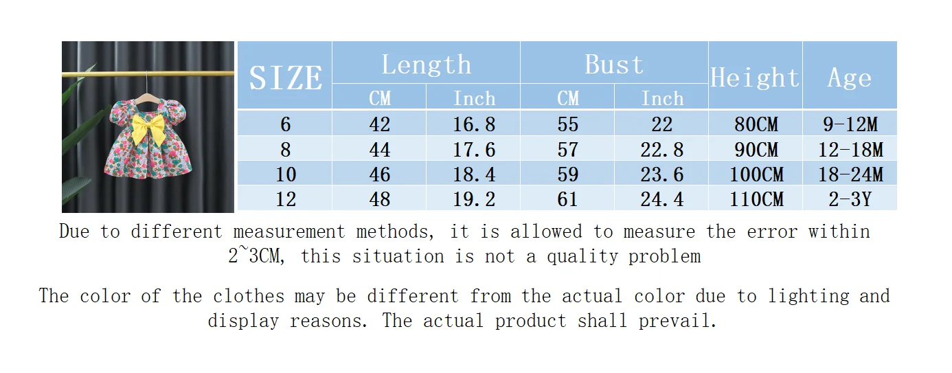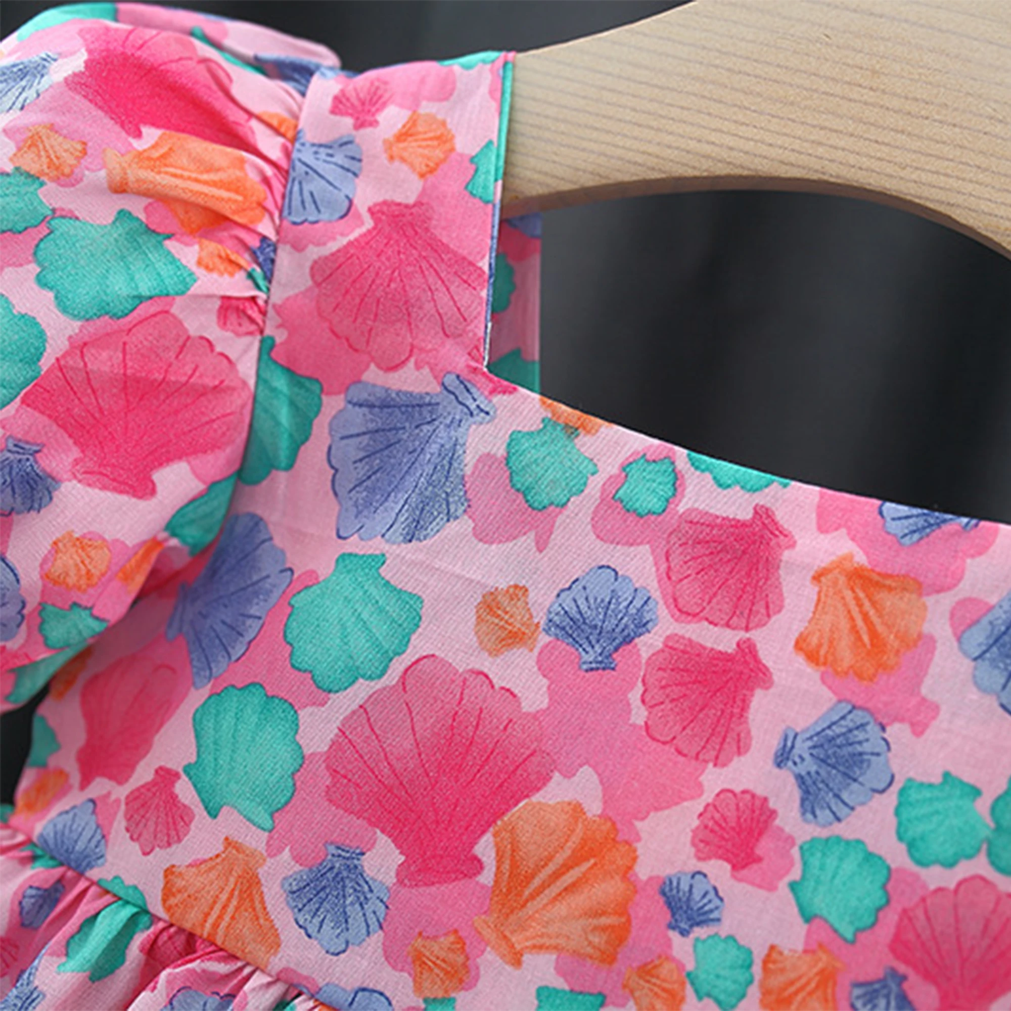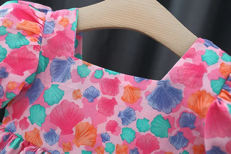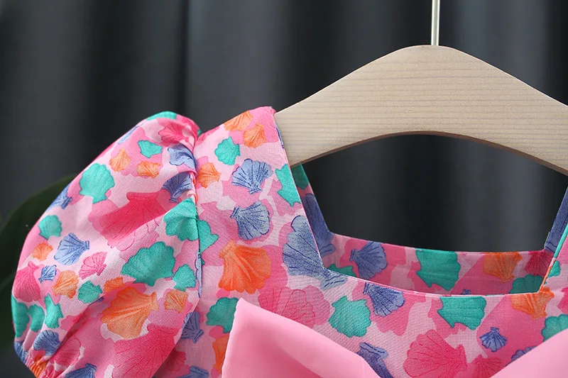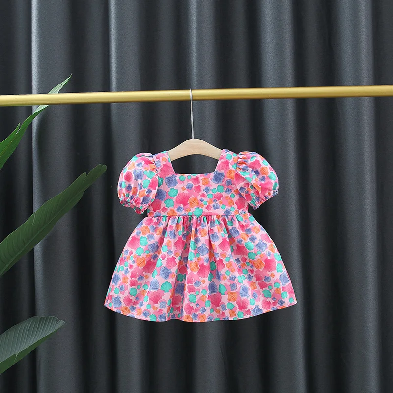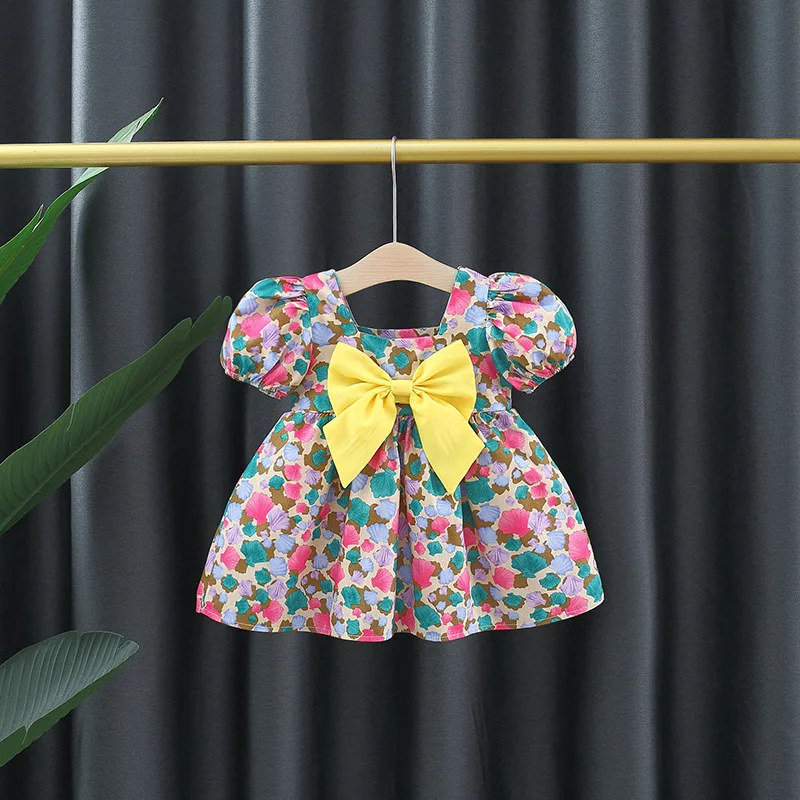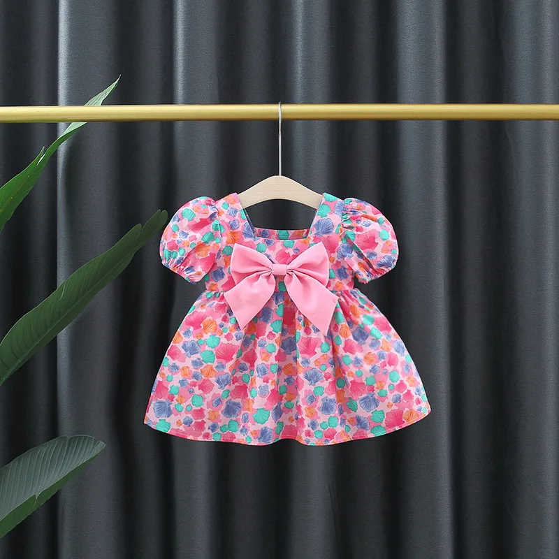 Baby Girl Summer New Dress Sweet Shell Printed Bubble Sleeves Big Bow Cotton Cloth Skirt Suitable for Children Aged 80-110