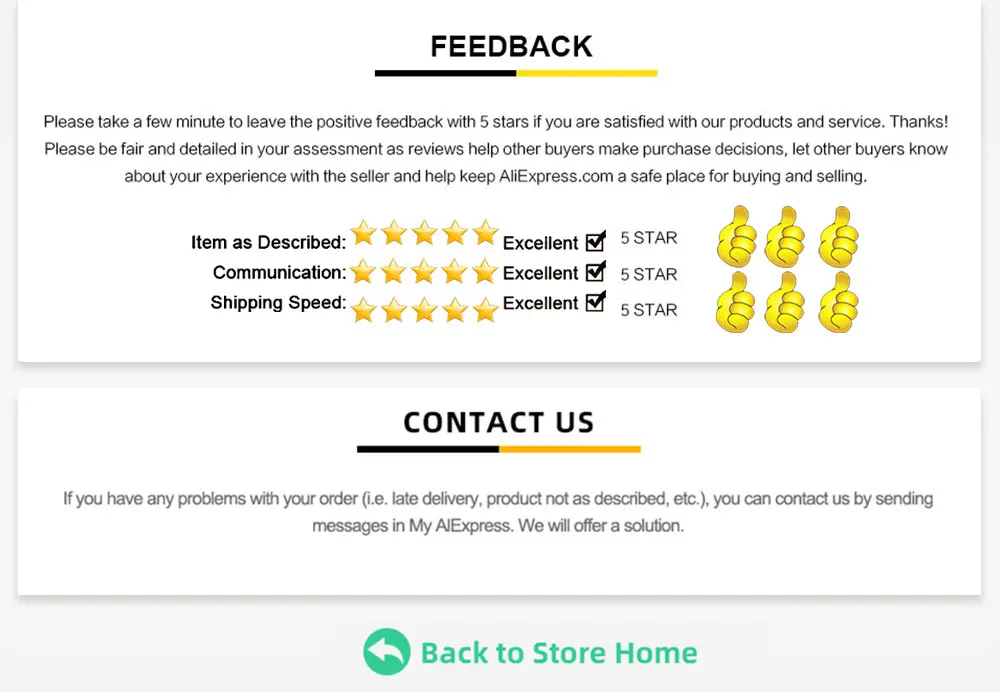 We sincerely invite you to leave us a positive feedback with an overall Detailed Selling Rating (DSR) of 5 Stars. When you show your nice picture on our feedback area please sent message tell us, the next order contact me, will be additional surprises.