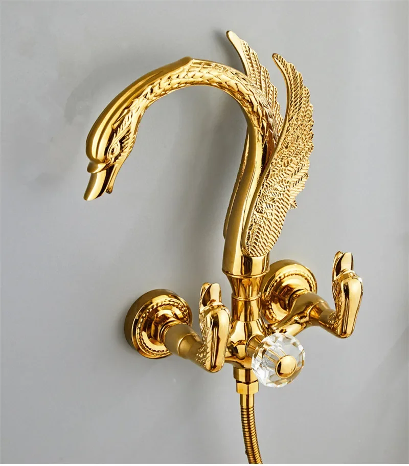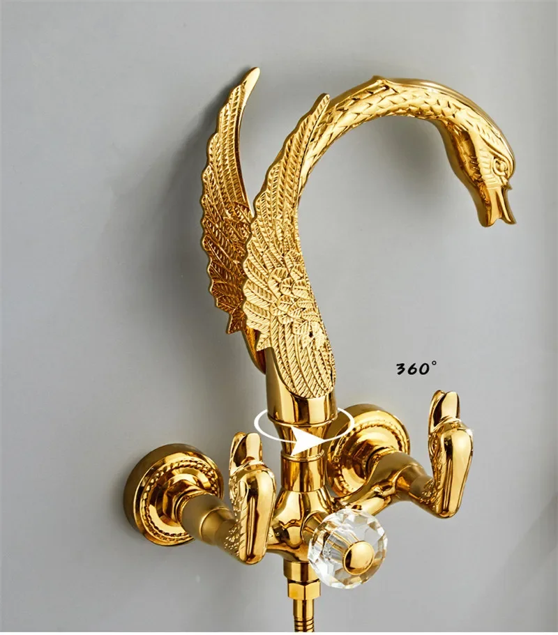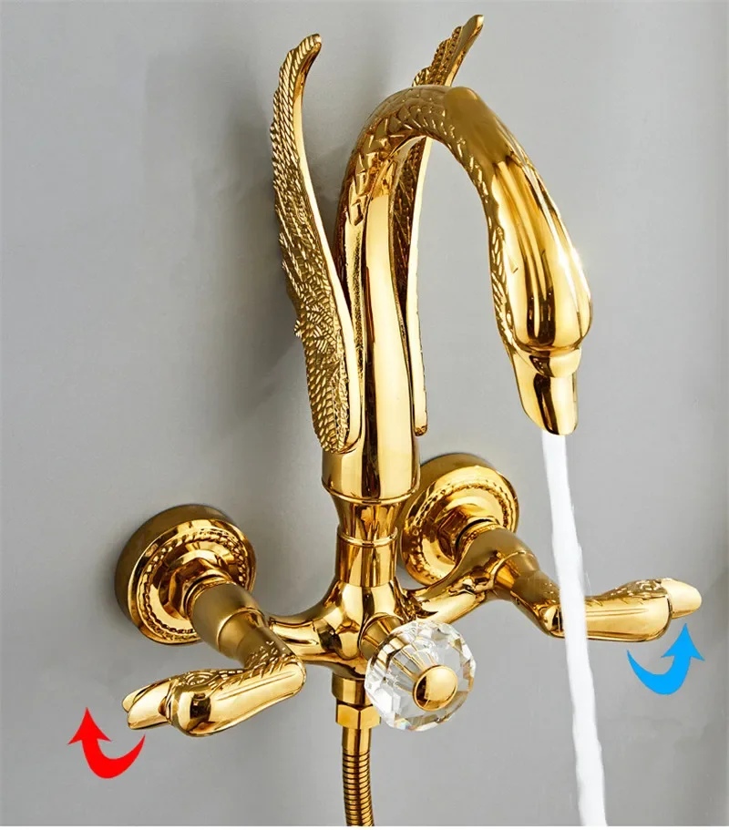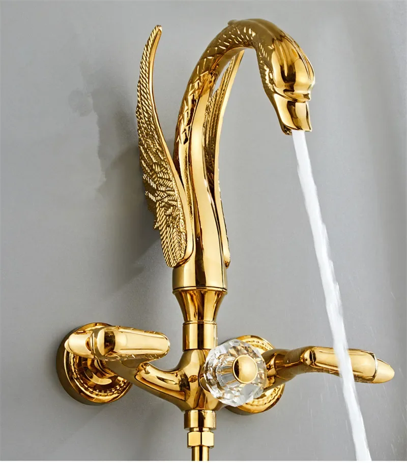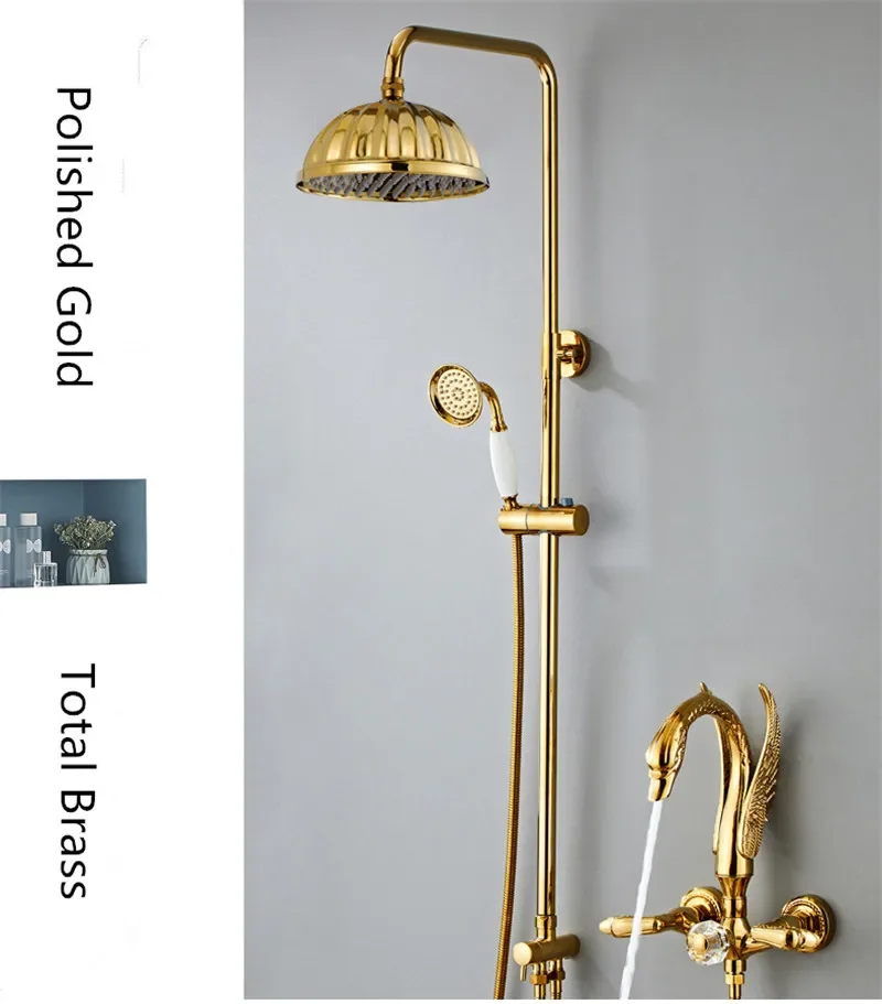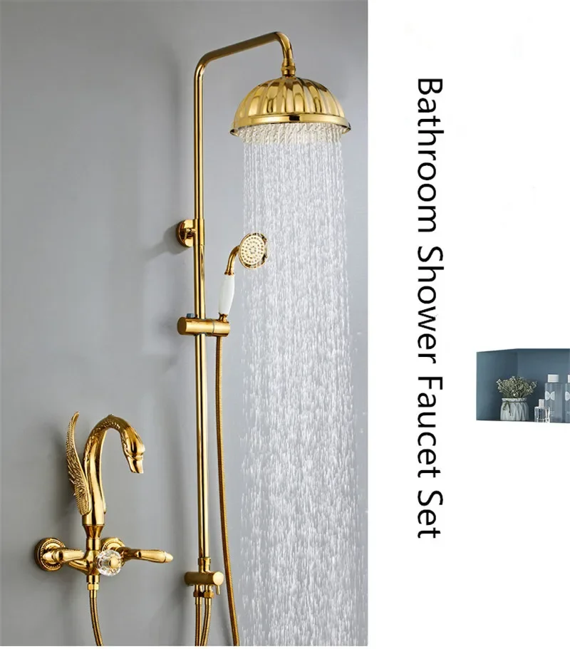 Bathroom Shower Faucet Set Gold Swan Bathroom Rainfall Shower Mixer Tap Polished Gold Brass Bath and Shower Faucet Set