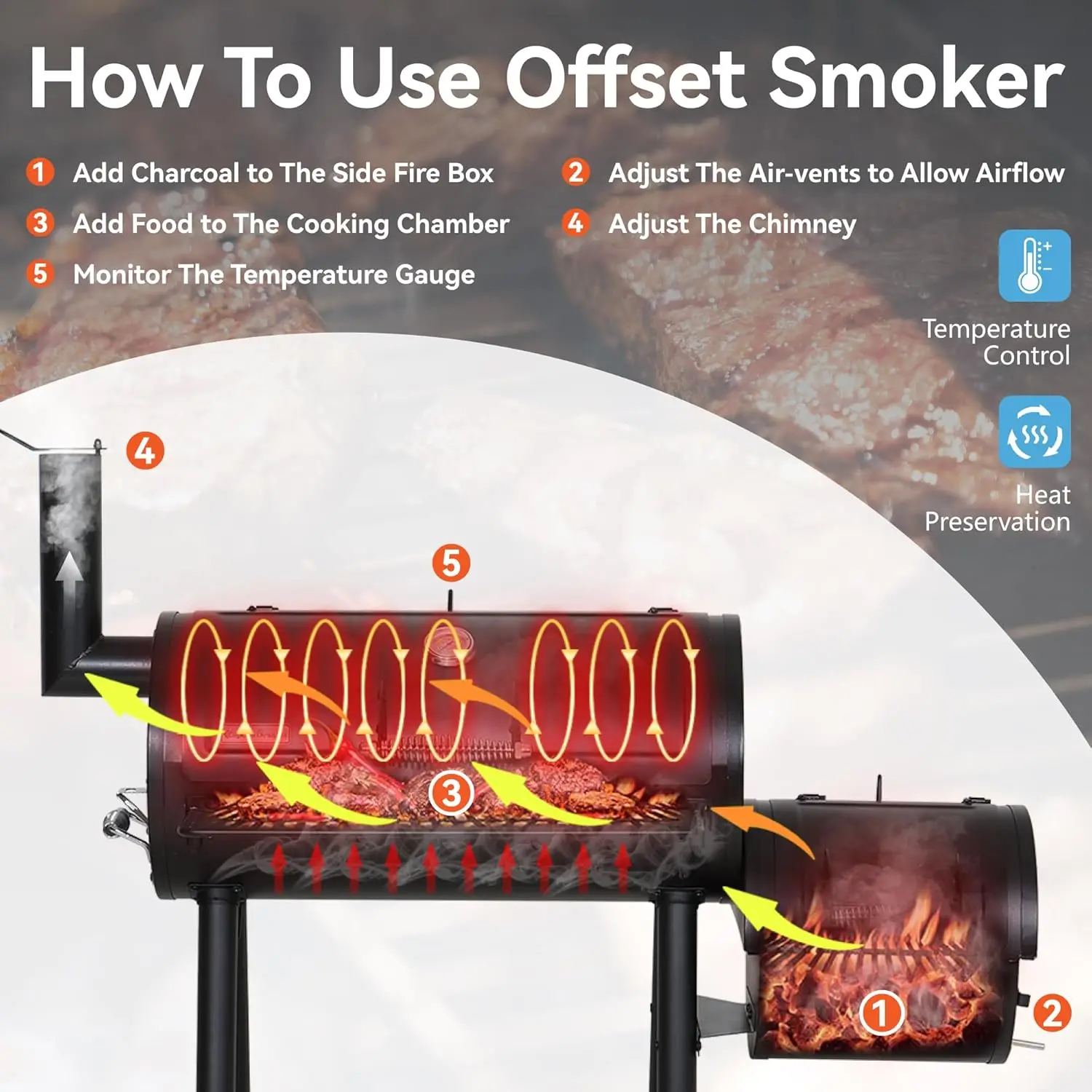- 2 IN 1 SMOKER & CHARCOAL GRILL COMBO: Designed for use as either a traditional offset smoker or a charcoal grill. We provide charcoal grates for the main chamber and grilling grates for the side firebox. This allows the large smoker to be easily converted into a large charcoal grill.