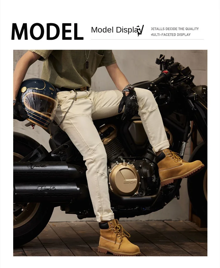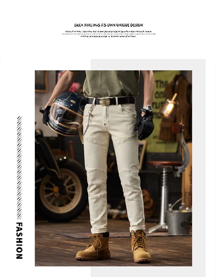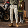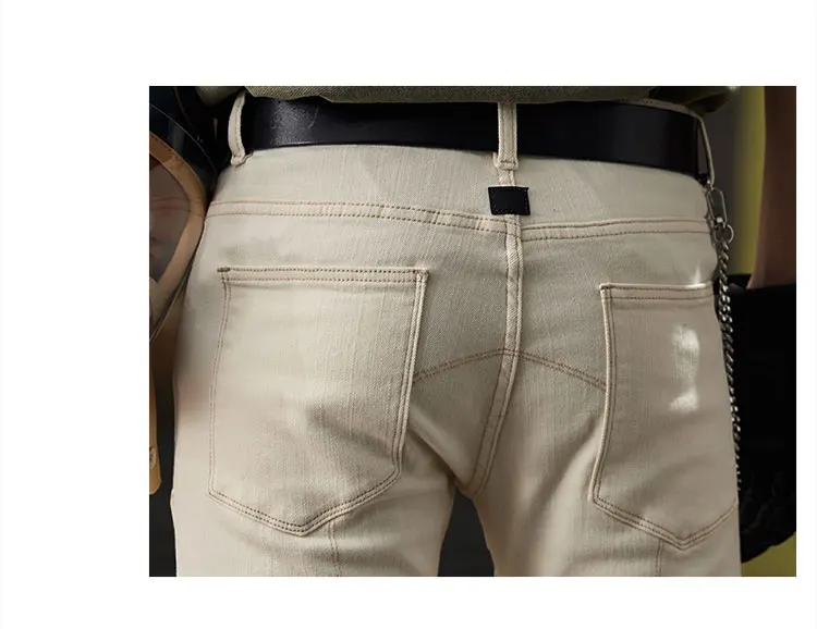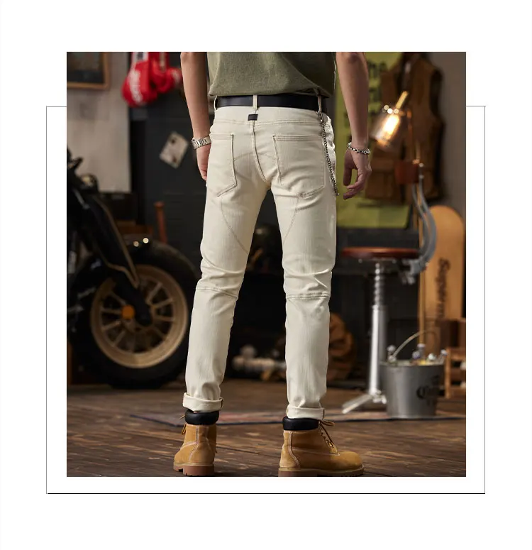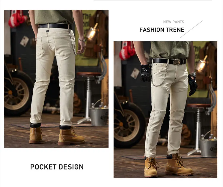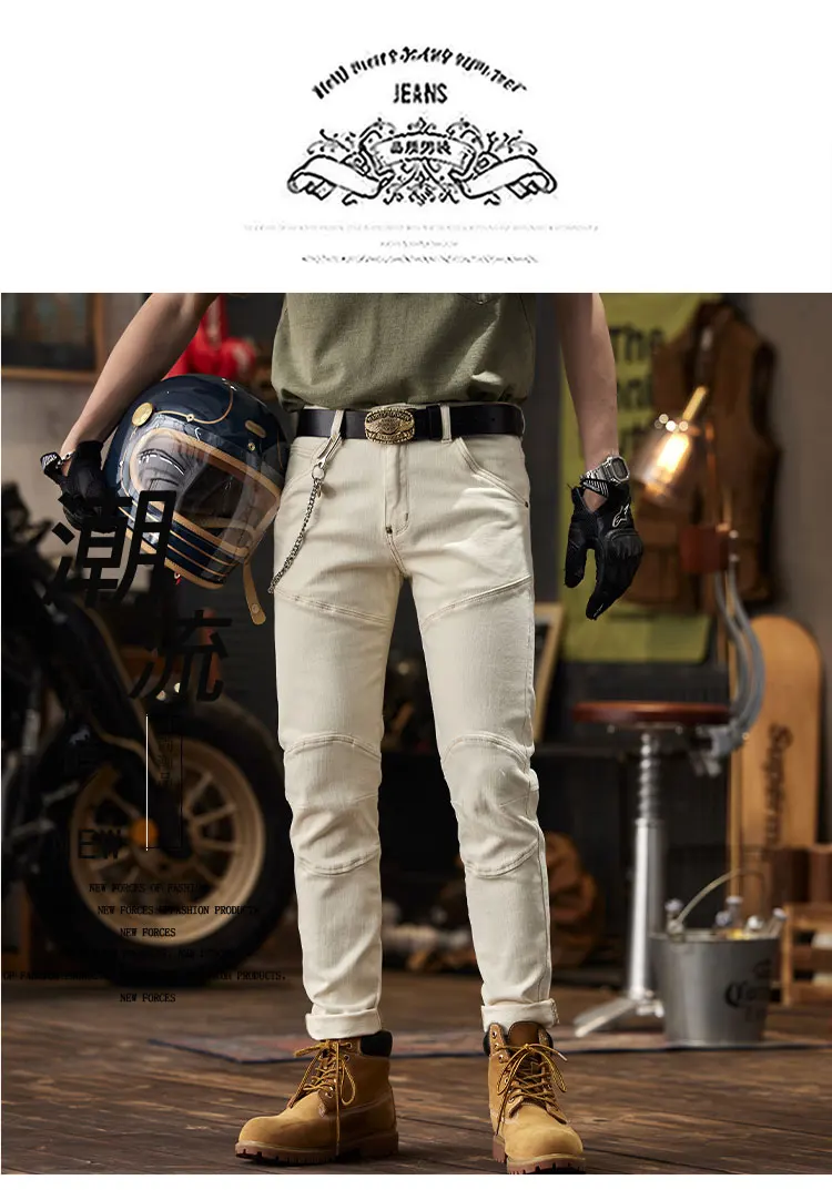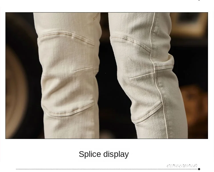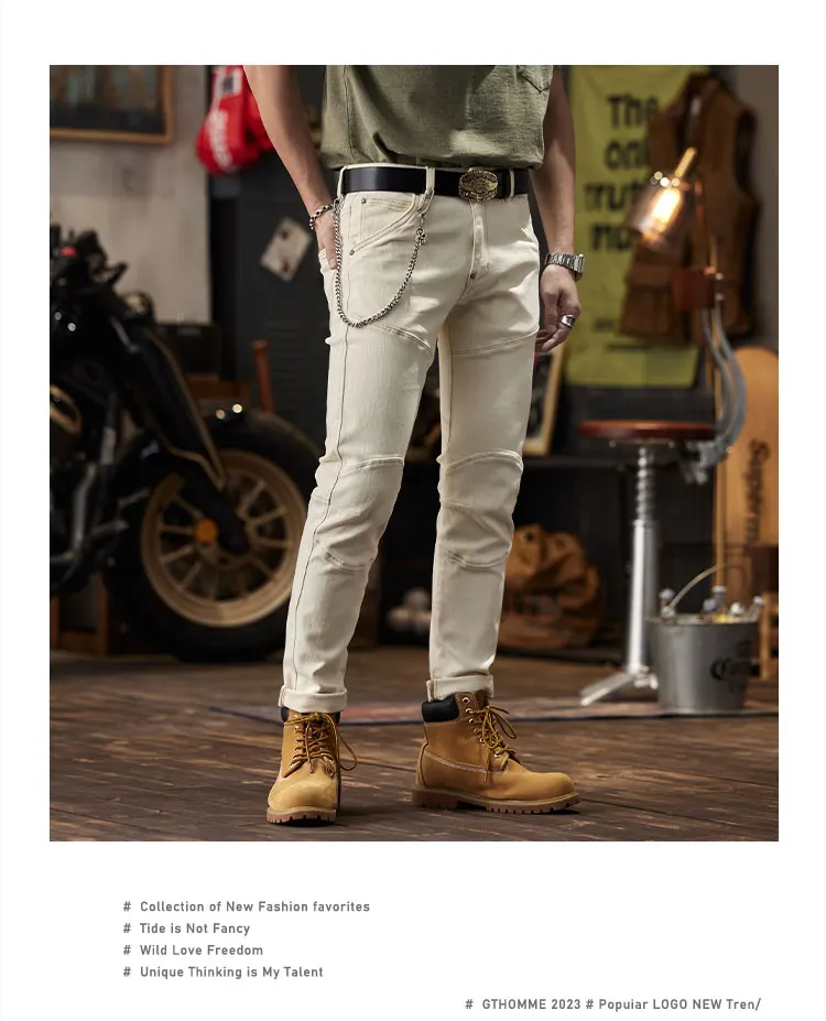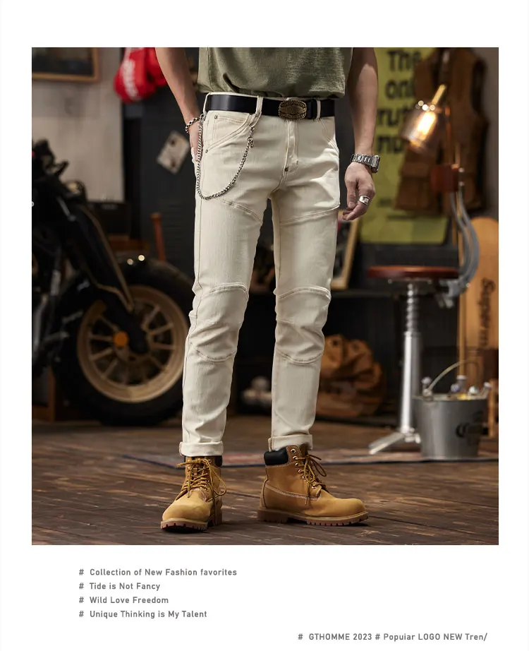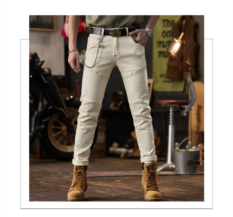 Beige Jeans Men’s Slim Fit Fashionable Retro Non-Mainstream Stitching Motorcycle All-Matching Long Pants Nightclub