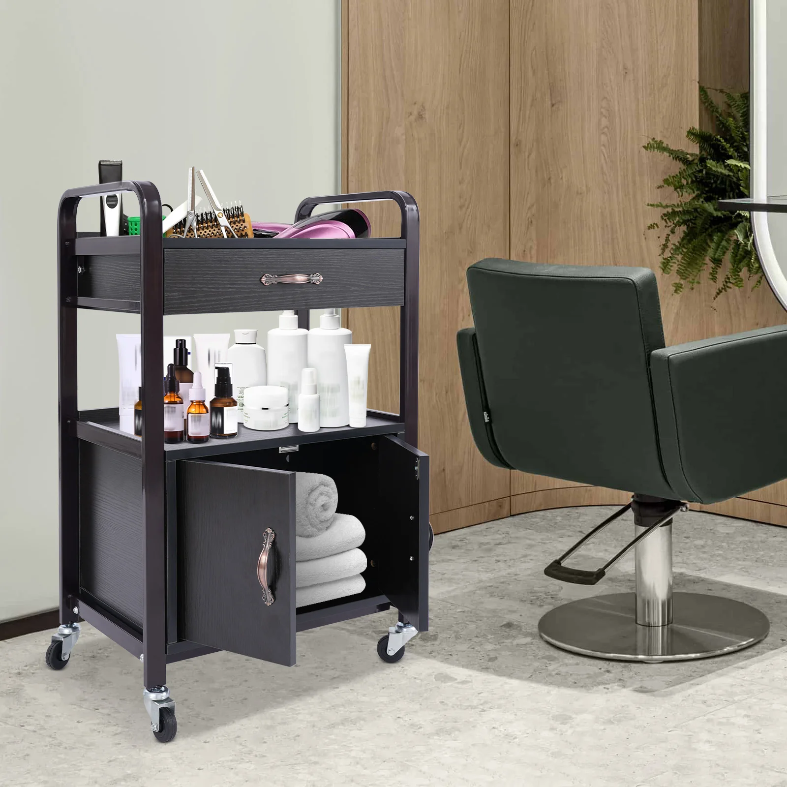 It is suitable for beauty salons, barber shops, nail salons, offices, living rooms, bedrooms, kitchens, manicure shops, spas, and other places. It can be used to store beauty and hairdressing tools, kitchen supplies, cosmetics, skincare products, etc.