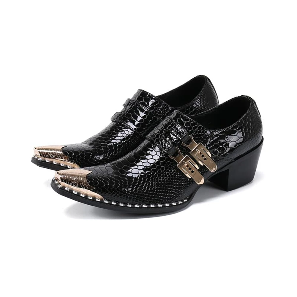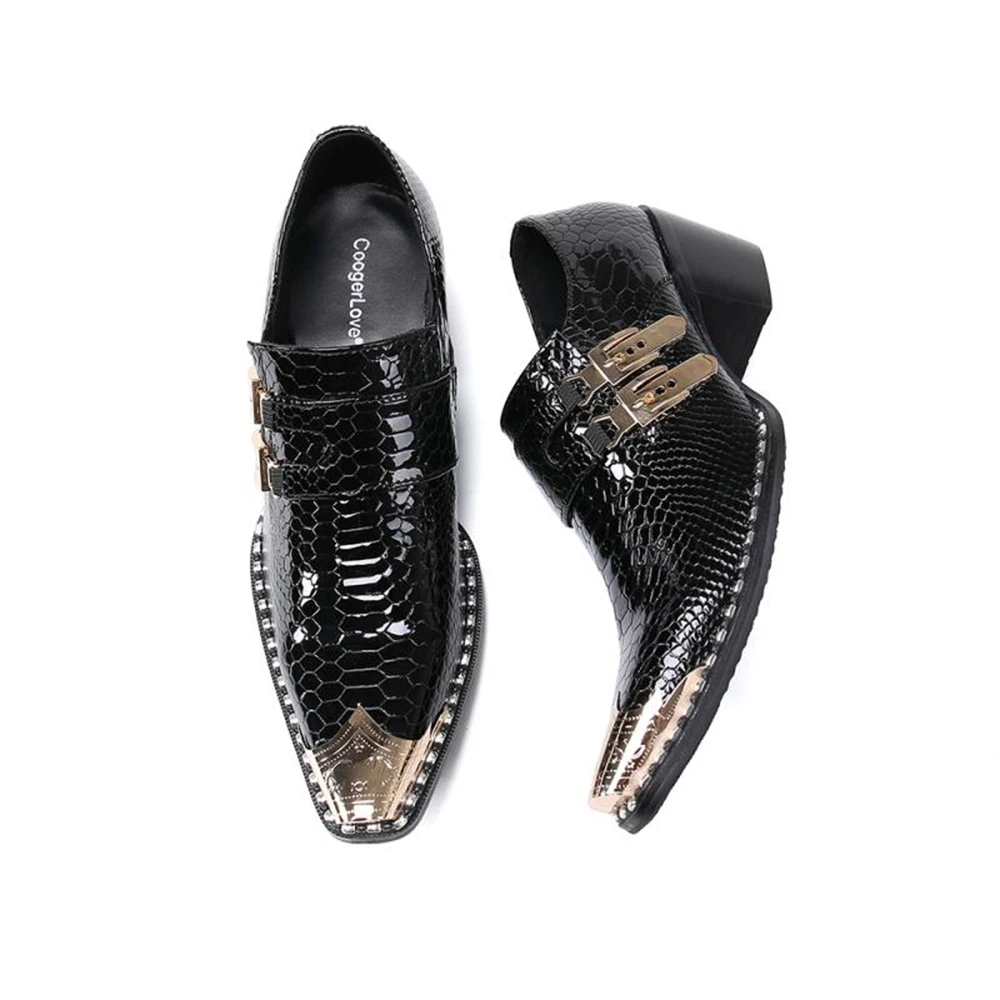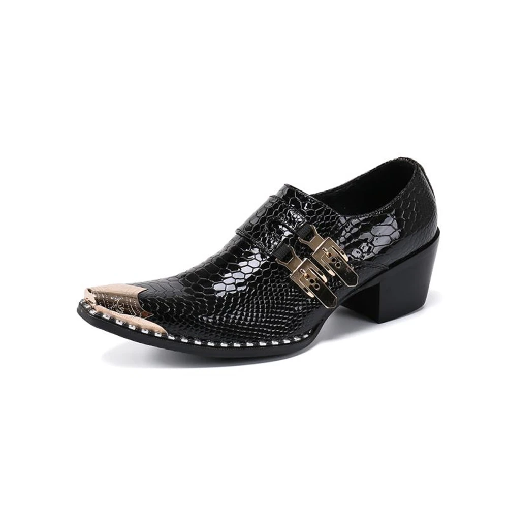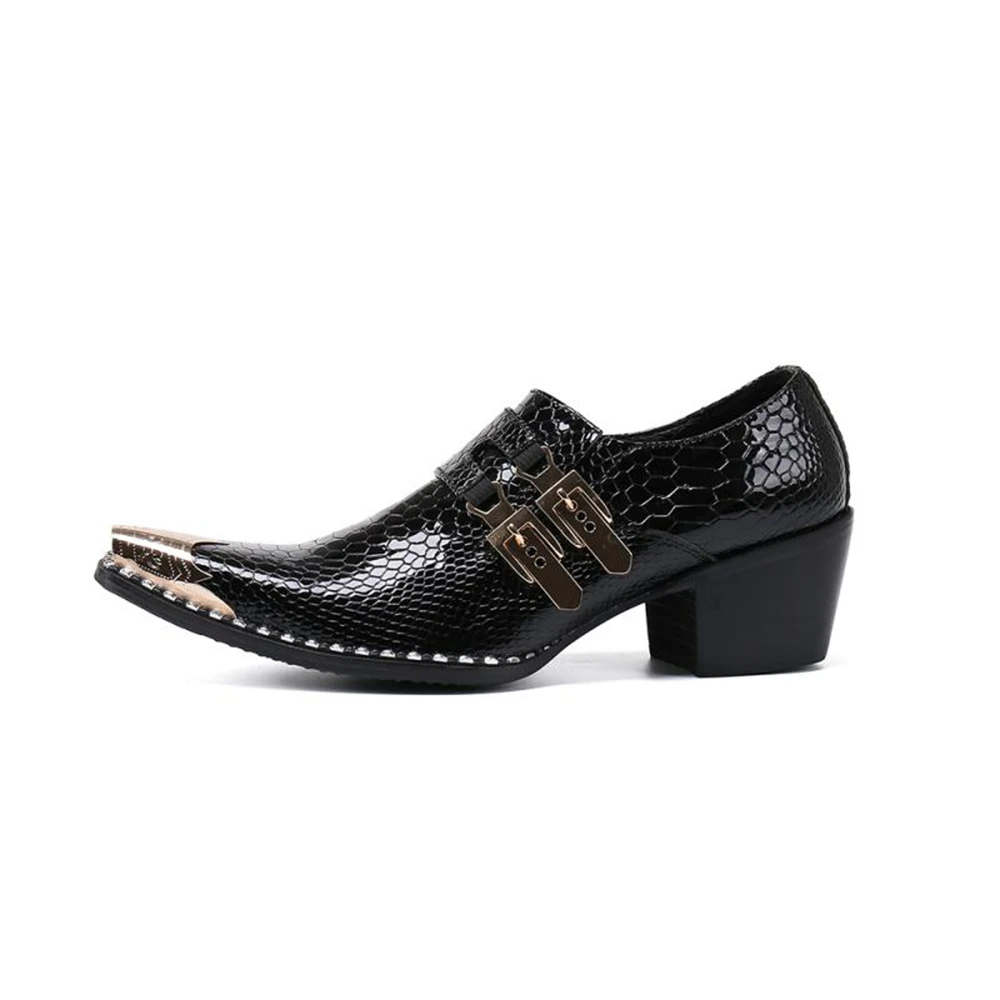 Black Red Pointed Toe Dress Shoes Men Office Genuine Leather Breathable Buckle Slip On Snake Pattern High Heels Shoes