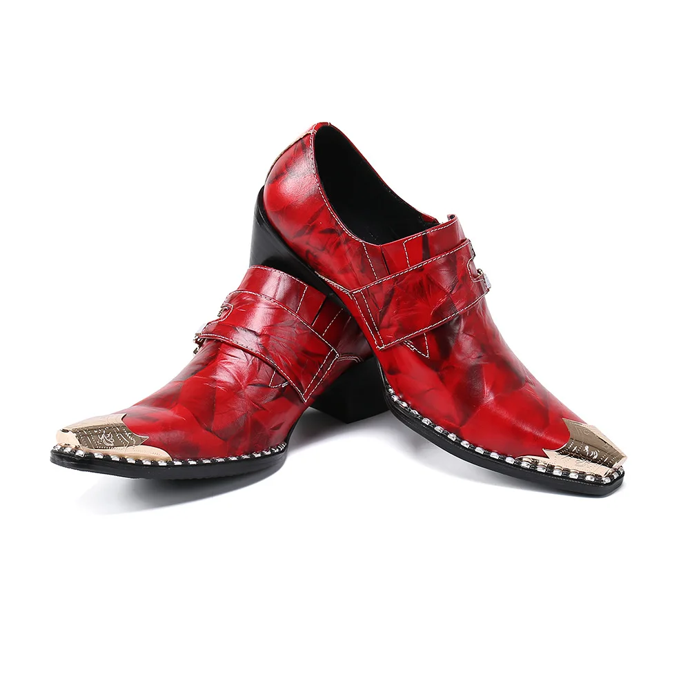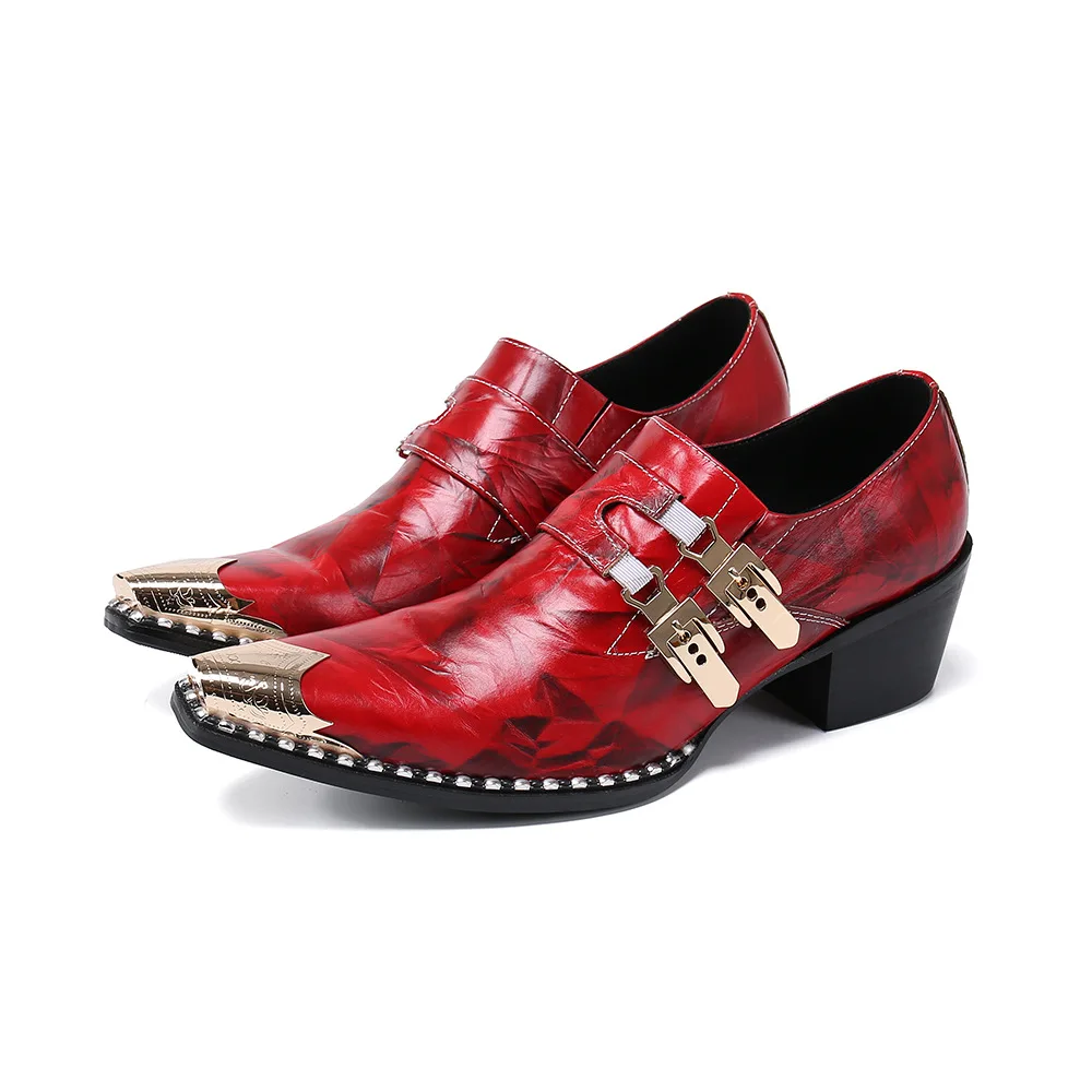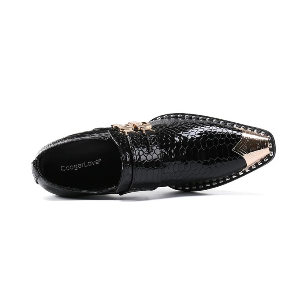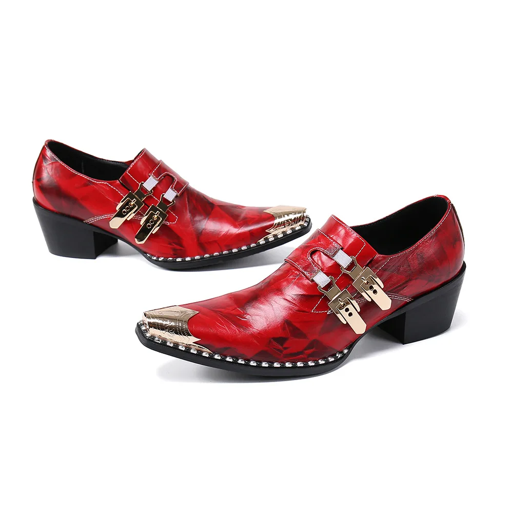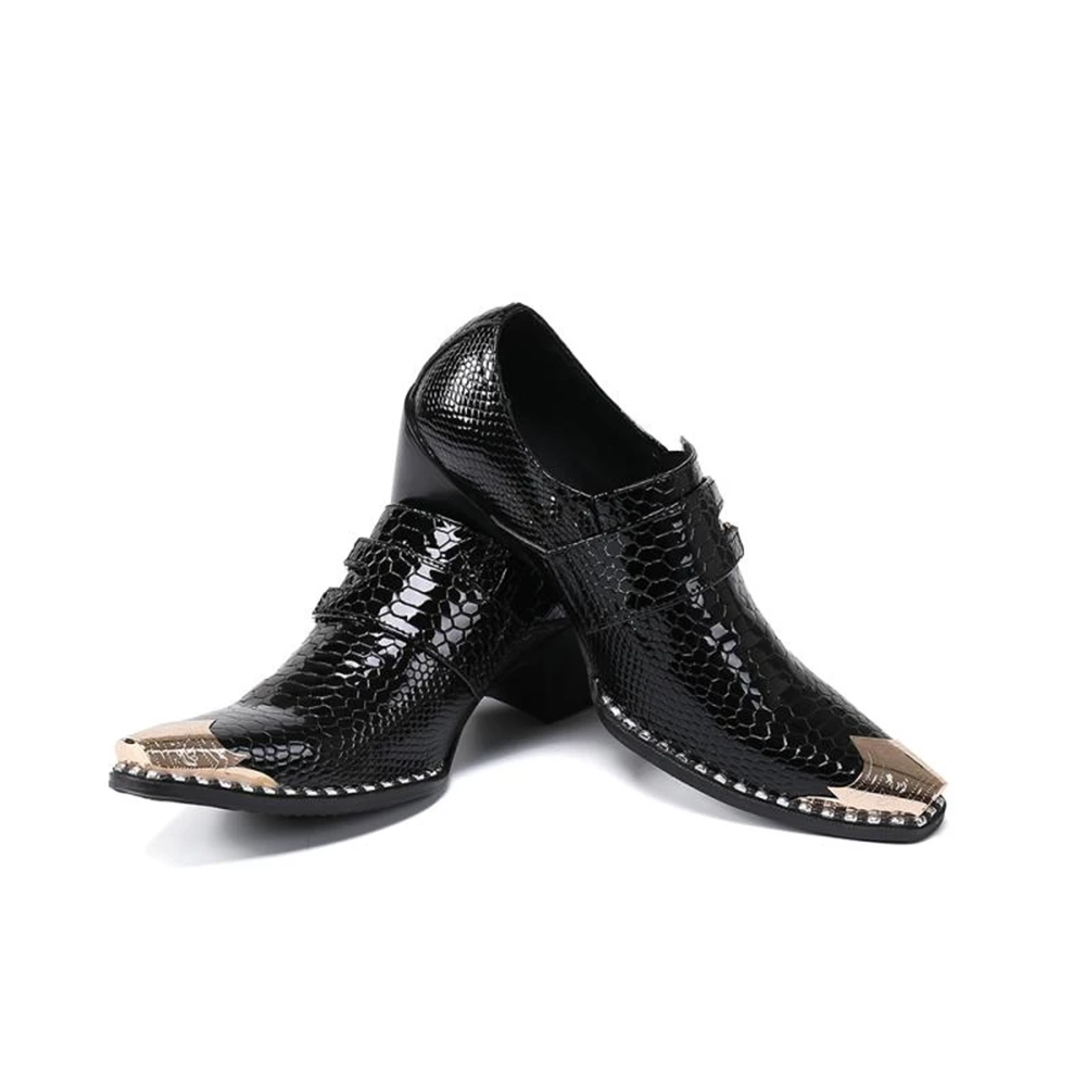 Black Red Pointed Toe Dress Shoes Men Office Genuine Leather Breathable Buckle Slip On Snake Pattern High Heels Shoes
