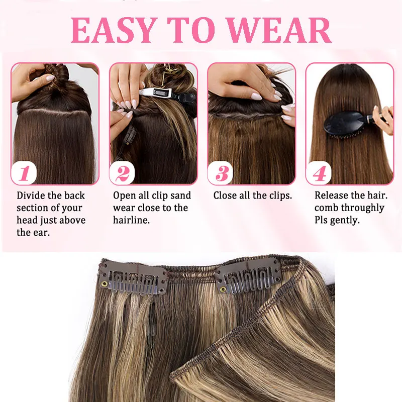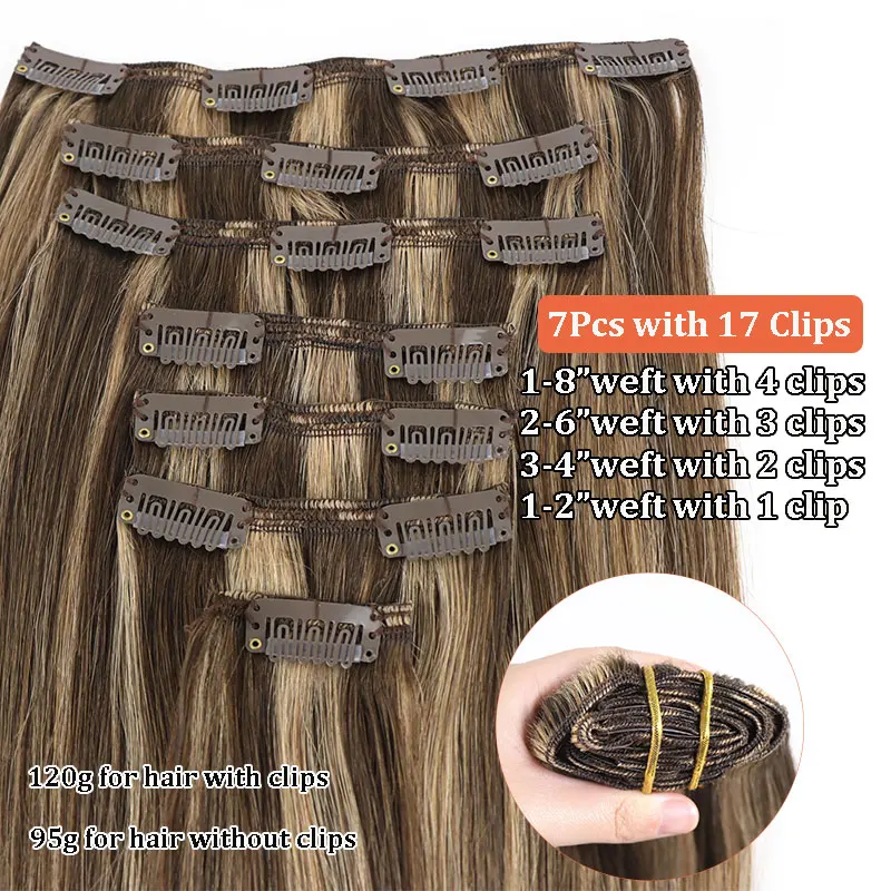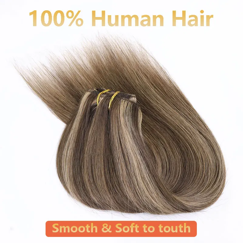 Blonde Clip In Human Hair Extensions Invisible #4/27 Balayage Brown Highlight Clip In Extensions For Women 7Pcs/Pack 120g